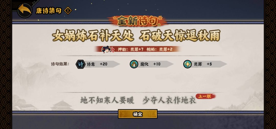 诗词系统需要带诗人名臣才能开启,军事位和政治位上暂时只有一位诗人。每一句诗句至少给10诗意,还附带其他属性。成功相粘给2灵犀,不粘减5诗意,押韵给7灵犀,不押韵增加集诗的消耗,所以优先押韵,因为即使不相粘给的诗意也是正的,带上杜甫减2(减1也可以)消耗差不多可以无限集诗。集诗需要用到灵犀,基本上每个诗人名臣都有自己的获得方式,这个我就不仔细说了,主要讲一下怎么集诗。