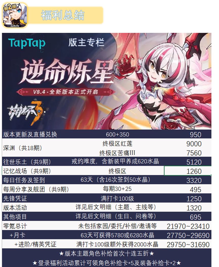 (注:因家园打工、冒险委托、bug补偿、版本后期小活动、分享邀请等事项水晶收入量不定且未纳入统计,最终估算数较保守)