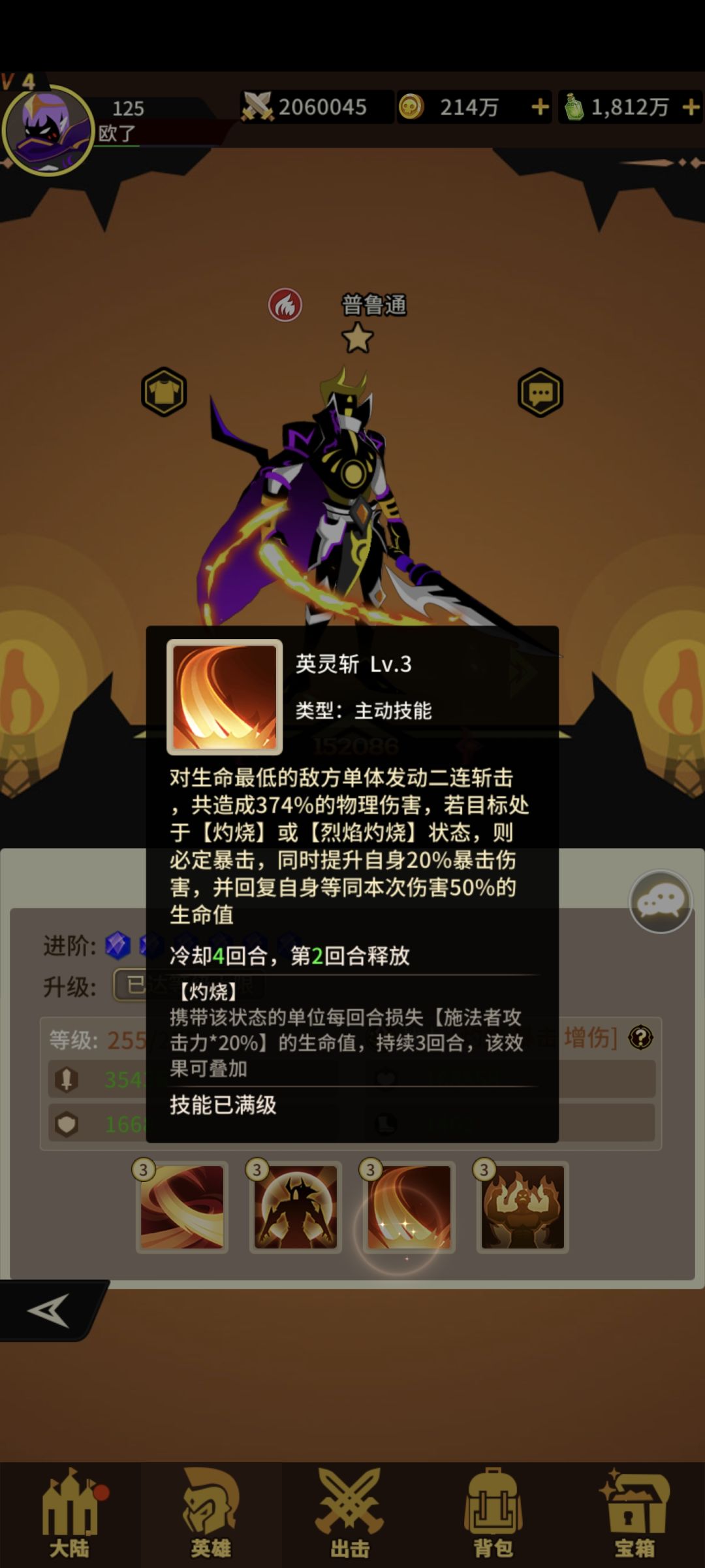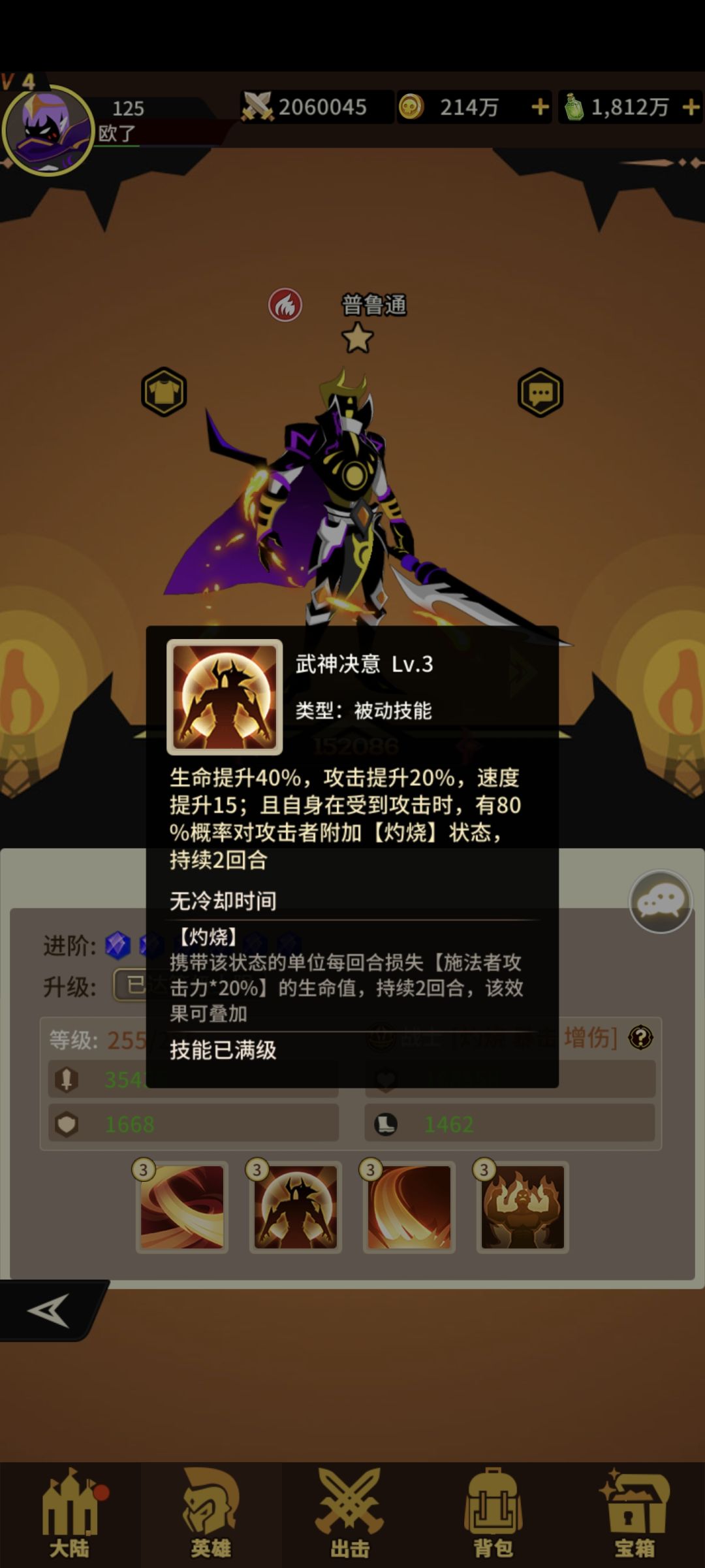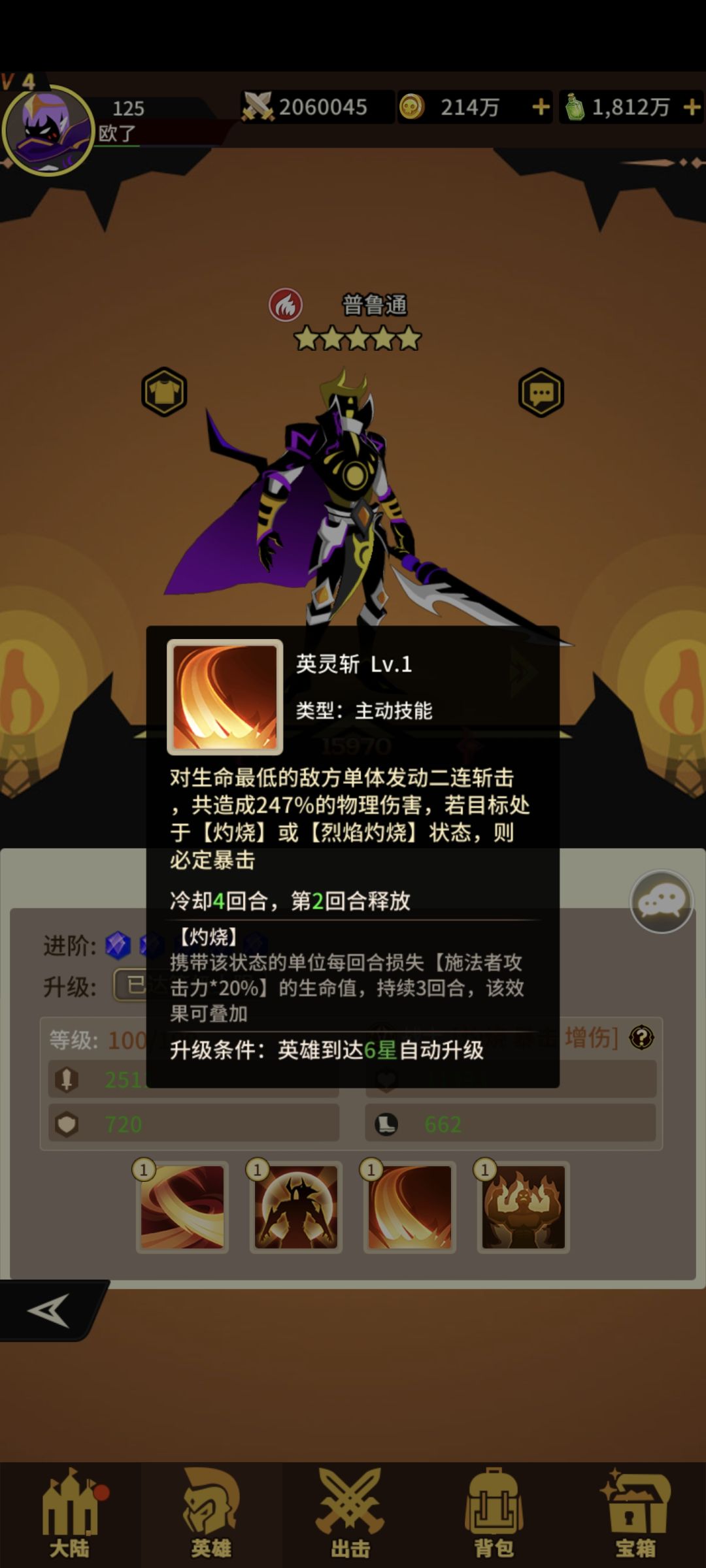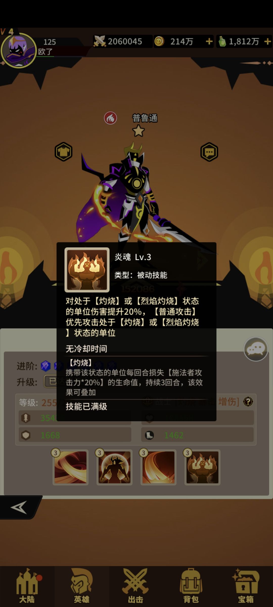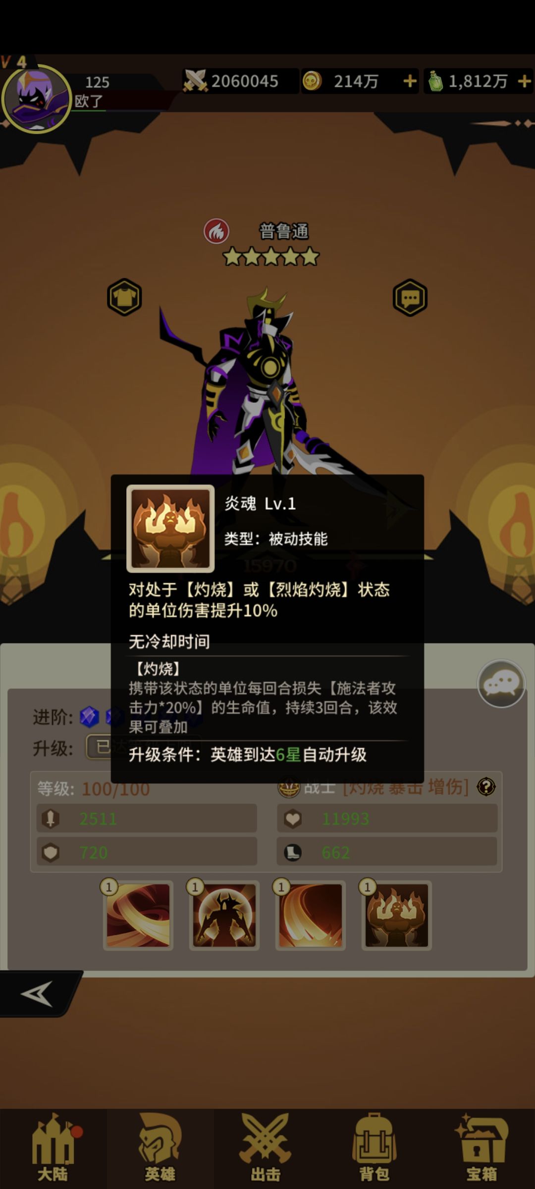 火系战士普路通四技能!获取难度难!抽卡+积分兑换+宝箱!一技能打前中排概率+灼烧如果打的是坦克增加伤害!二技能+生命+攻击+速度满级自身收到攻击概率给施法者+灼烧 三技能打生命最低的敌人单体攻击目标带灼烧或烈焰灼烧必定暴击!四技能对处于灼烧或烈焰灼烧的敌人+伤害!满级优先打带火焰状态的敌人!优秀的战士!