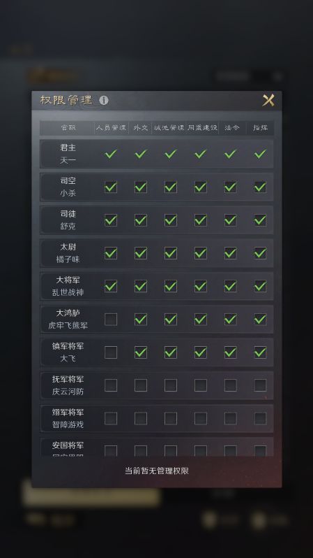 盟主、副盟主负责同盟大小事宜;军师负责沙盘指挥和军队调度;史官负责成员出入和外交;校尉比较灵活,根据其擅长和活跃度灵活安排同盟权限;城主则只负责城池建筑和军团的操作。