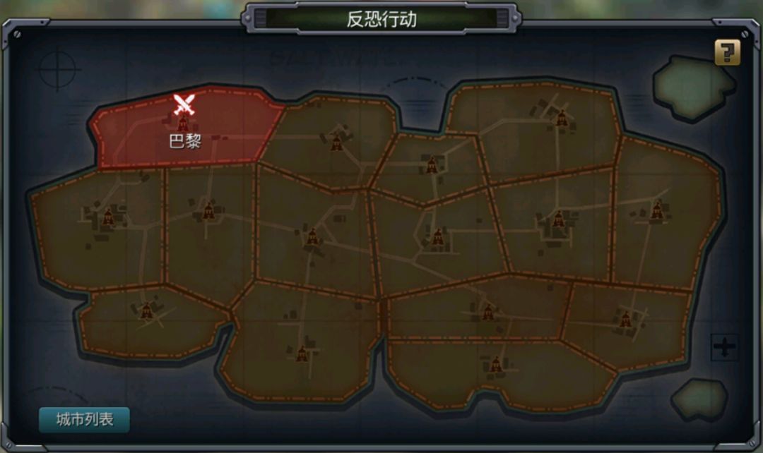 城市分布在大地图中,通过反恐行动界面进行快捷跳转每个城市满足条件后可进行攻击;当前城市成功恢复和平后,才会开启下个城市