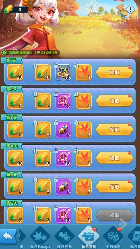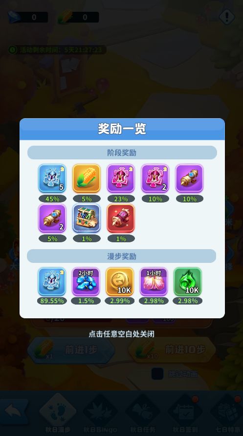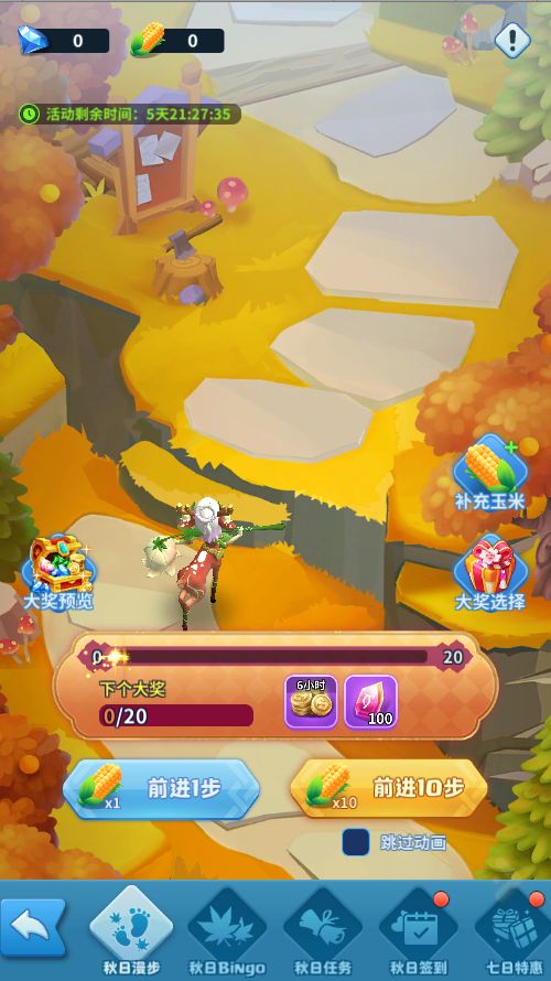 1、秋日漫步:活动期间,可以消耗玉米增加漫步进度,完成对应阶段时可以获得阶段奖励