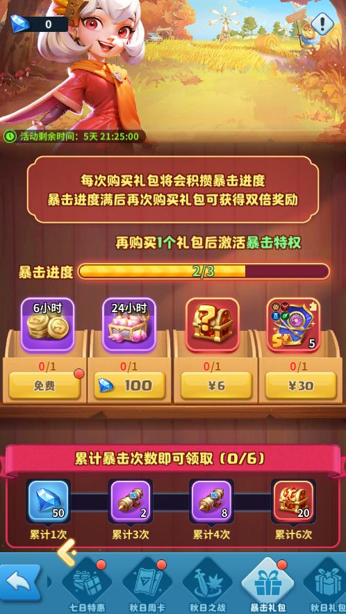 7、暴击礼包:活动期间在此领取或购买礼包均可积累暴击进度,进度累满后的下一次领取或购买均可获得该礼包的双倍奖励