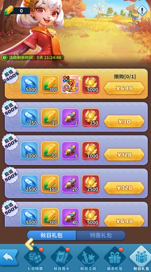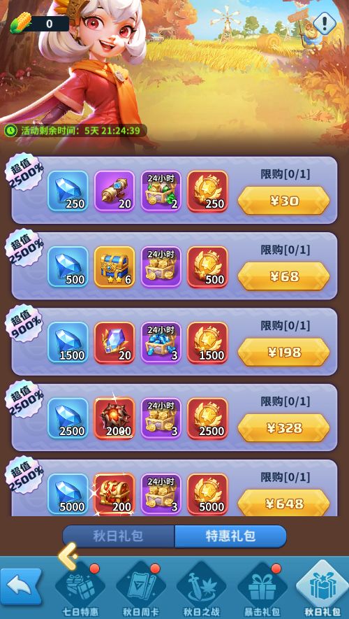 9、秋日礼包:活动期间,开放秋日礼包和特惠礼包的购买