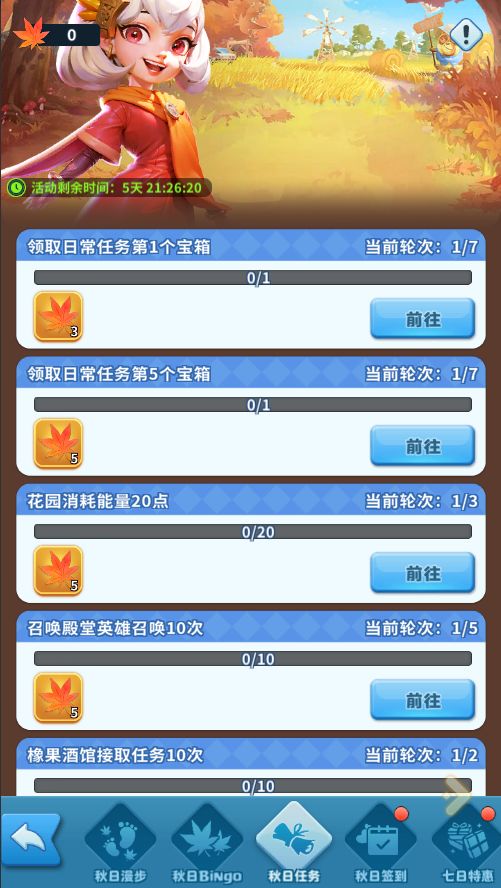 3、秋日任务:活动期间,可通过完成指定任务获得枫叶,每个任务可以完成多轮