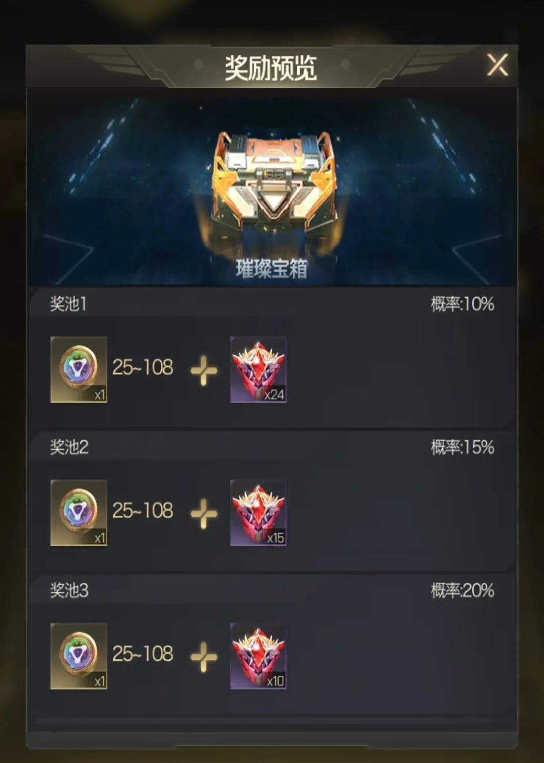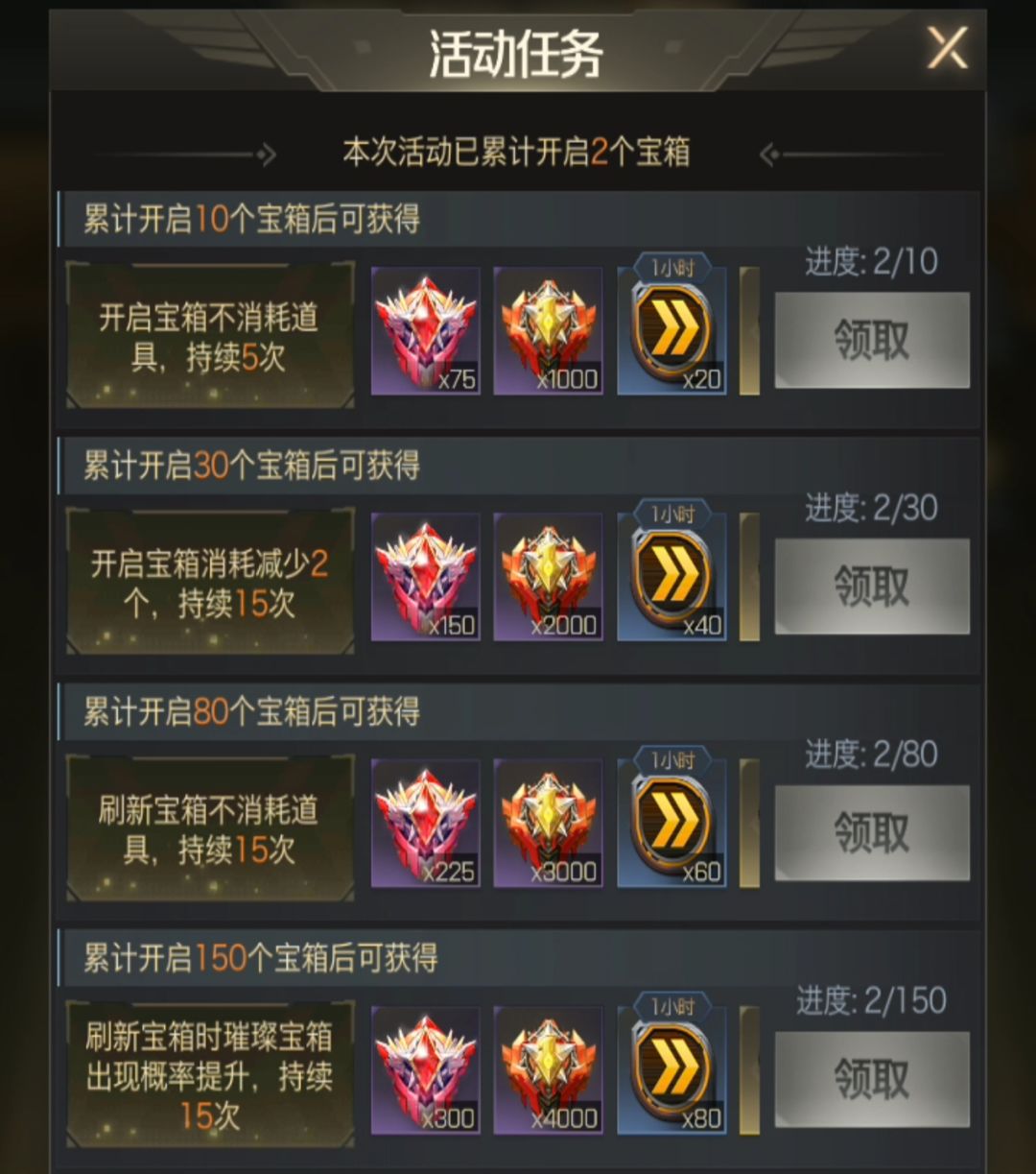 一、活动期间,累计开启一定数量的宝箱完成活动任务,可额外获得道具奖励和buff加成,道具包括炽耀勋章、星耀勋章和一小时通用加速,buff加成有开箱持续15次消耗减少、不消耗、刷新宝箱时璀璨宝箱出现概率提升等,建议有条件的同学直接做满240个箱子,拿到全部奖励。