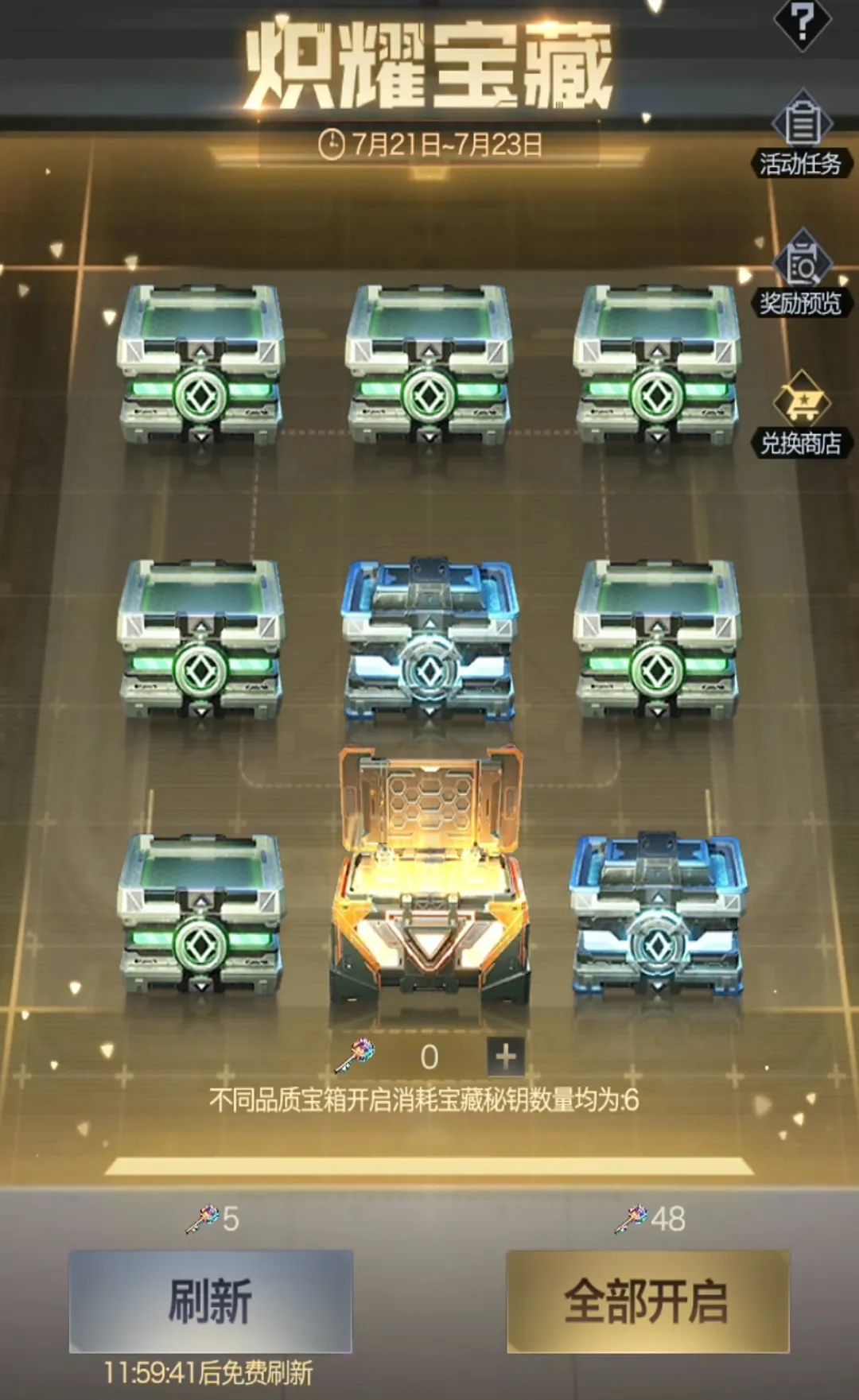 三、关于刷新次数,建议不要过多纠结必须等到璀璨宝箱的时候开,毕竟刷新一次也是要消耗5个钥匙的,且有80次刷新次数的限制,只要9个箱子里有2-3个稀有宝箱,就可以开。以上就是今天跟大家分享的炽耀宝藏活动的玩法攻略,欢迎评论区交流!