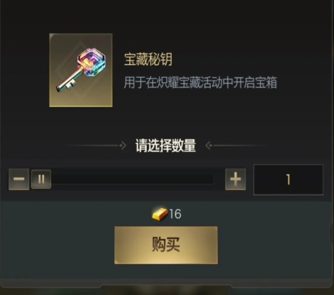 二、活动期间可以消耗金条直接购买宝藏秘钥,宝藏秘钥体每期活动可购买4800次且道具活动结束后不回收,大家可以根据自己情况配合着做联盟总动员消耗金条任务购买,不用担心买多了浪费掉。