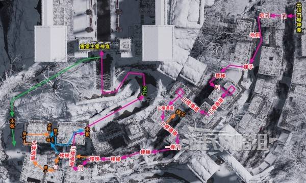 下图粉色箭头路线为从【云顶内城】神龛前往【雪堡主堡】神龛的路线,橙色箭头为近路,蓝色箭头为岔路,最终都能绕到粉色路线上。绿色箭头是从【雪堡主堡】神龛到内城另一侧的路,最终也能回到粉色路线上来。