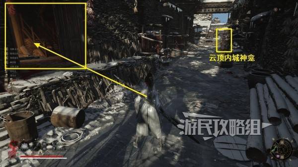 【云顶内城】神龛对面的门,可以参考下图,从旁边的房子进入屋内,再从屋内开启,屋内只有一条路,注意屋内的阴人小怪。