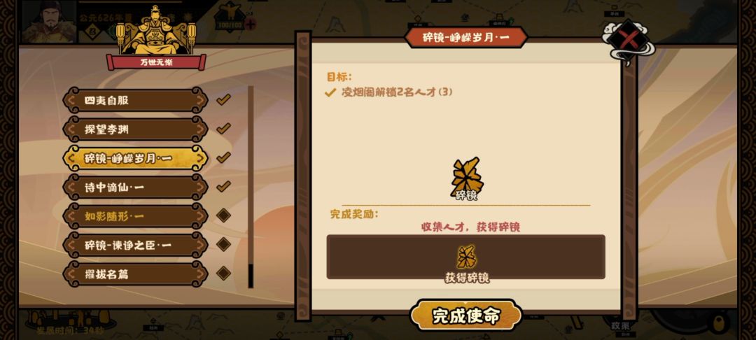 其他的碎镜任务比较简单没什么好说。峥嵘岁月要凌烟阁人才,凌烟阁人才你点进去会有怎么获得介绍。