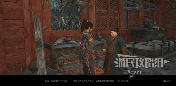 2、来到蜀王祠一楼,吴刚和女道士旁见到陶青,给他头陀的铜尊,商店解锁购买【防具】头陀套装。通过对话得知:头陀抢来戏班的冯小宛,被抓那俩小孩就是冯小宛的俩儿子。