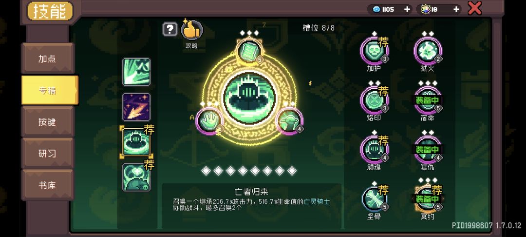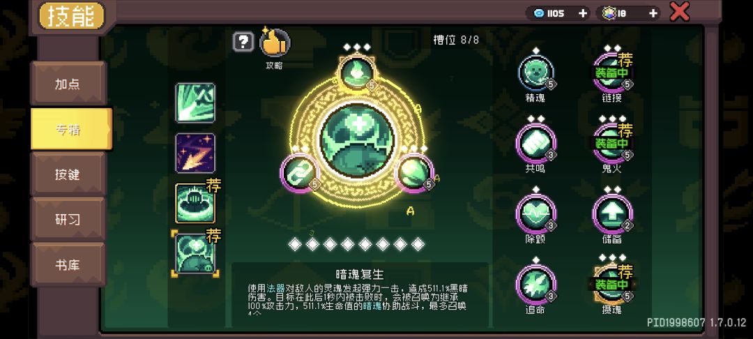 暗魂复生点到8级解锁8个专精位置:摄魂加鬼火 使暗魂冲击敌人造成伤害消失后触发冥约专精效果。并且发射暗能倾泻(可以消耗魂魄增加数量)通过专武效果使亡灵骑士吸收消耗生命发射造成大额伤害连接:使暗能倾泻投射物于怪物之间弹射,可与弹射羁绊叠加