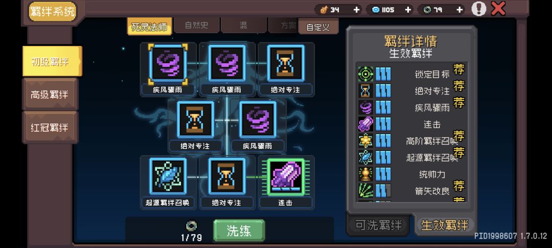 高级羁绊页:三个箭矢改良是必要的,剩下的位置有两个方案第1种就是三弹射加1精准加1自由位置(可以选择重蛋和精准),第2种就是三精准加二弹射,亡灵骑士也可以吃到吸血羁绊效果