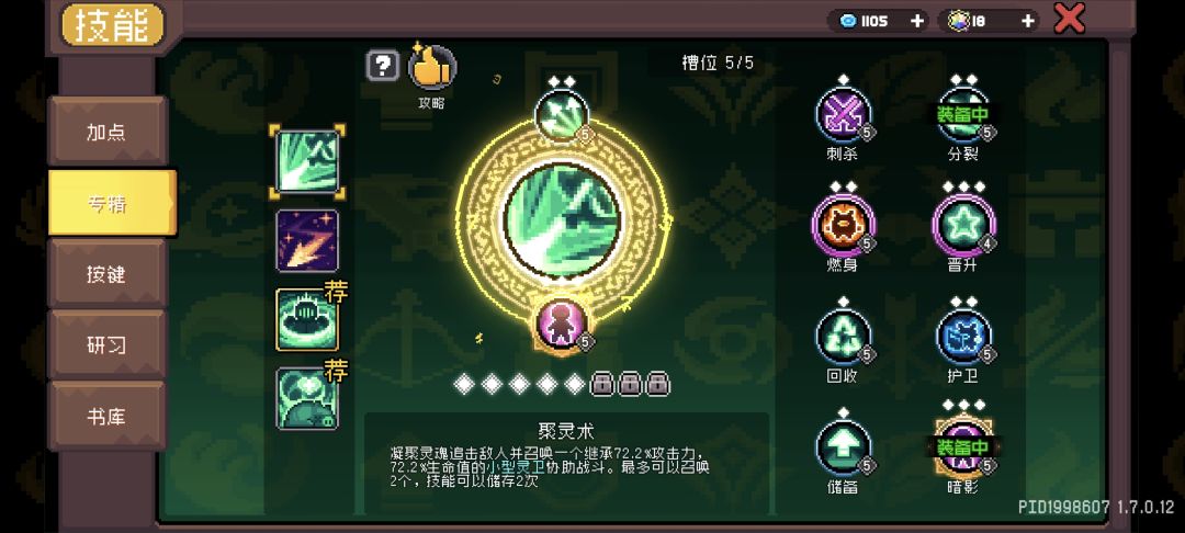 聚灵术点到5级分别装上暗影和分裂专精。暗影专精可以使小灵位去给敌人增加黑暗效果,分裂可以使小灵位的召唤数量增加,去增加暗能倾泻(在场每有一个召唤物增加10%伤害)的伤害。