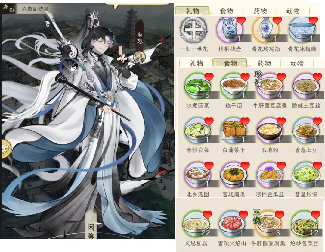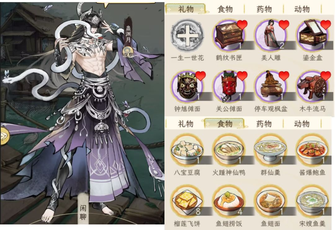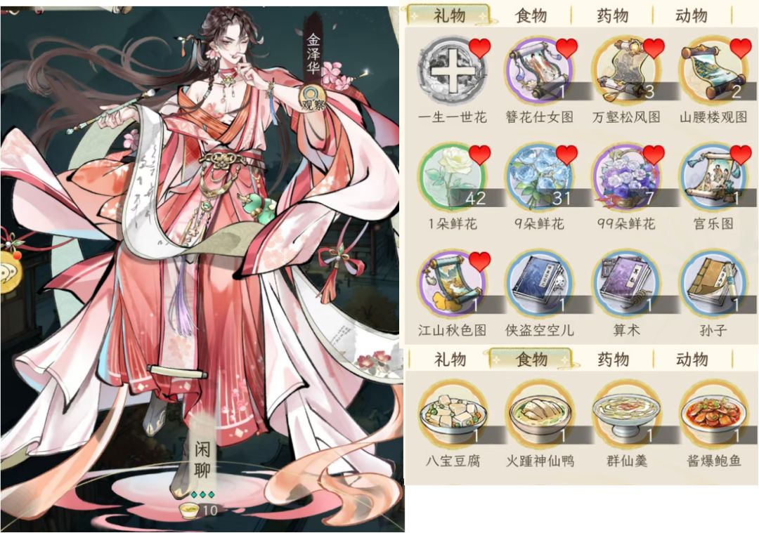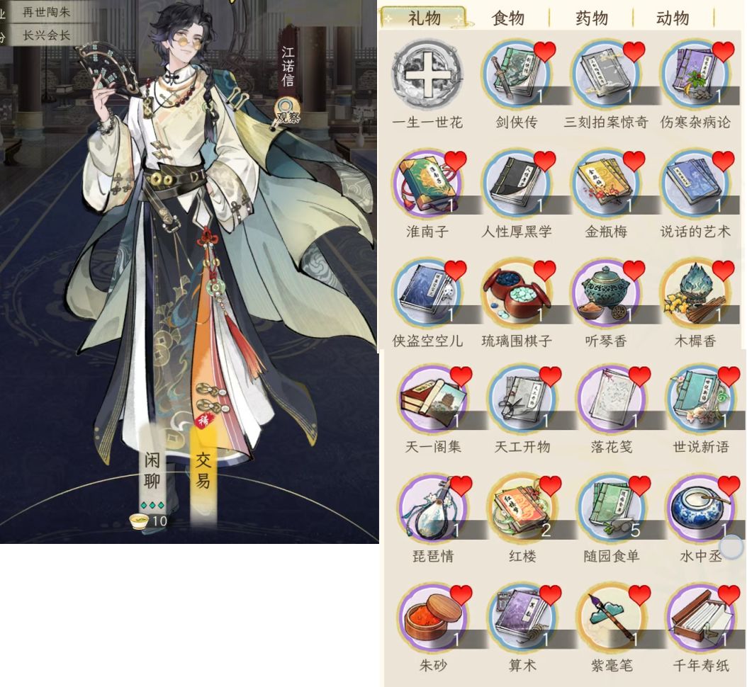 说在前头,考虑到礼品获取的难易度,所以这里用于测试的物品都是可以直接从“商城--市集--赠礼”中买到的,除了这些肯定还有其他,例如团福猫珑、仙肴食物,但是这些获取渠道不稳定,所以不考虑,仅供参考。