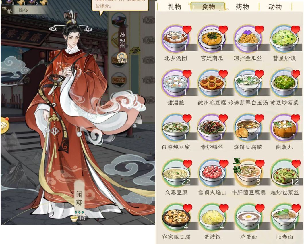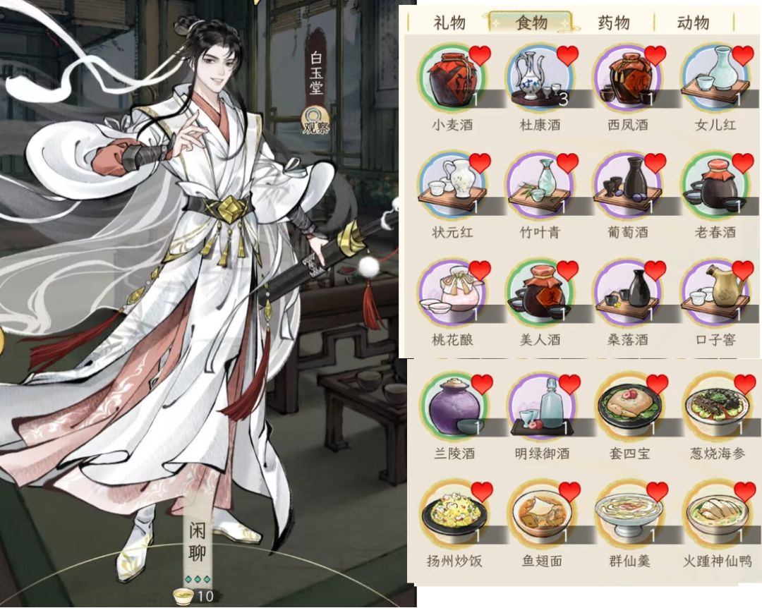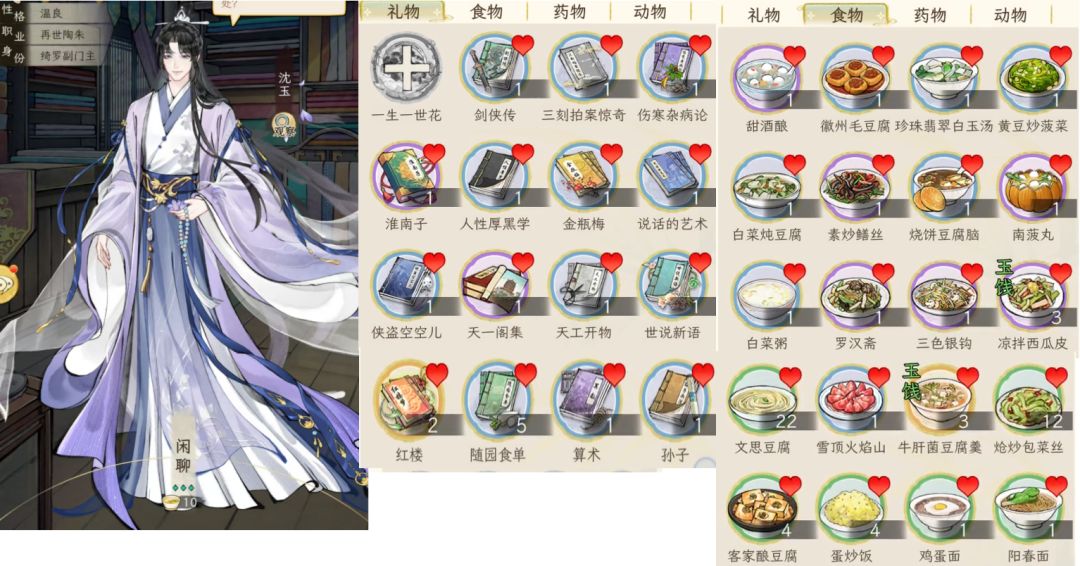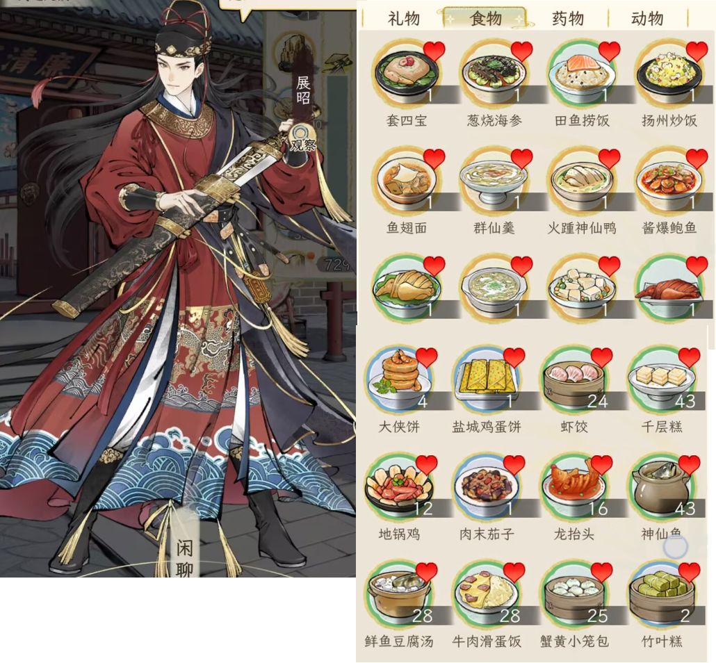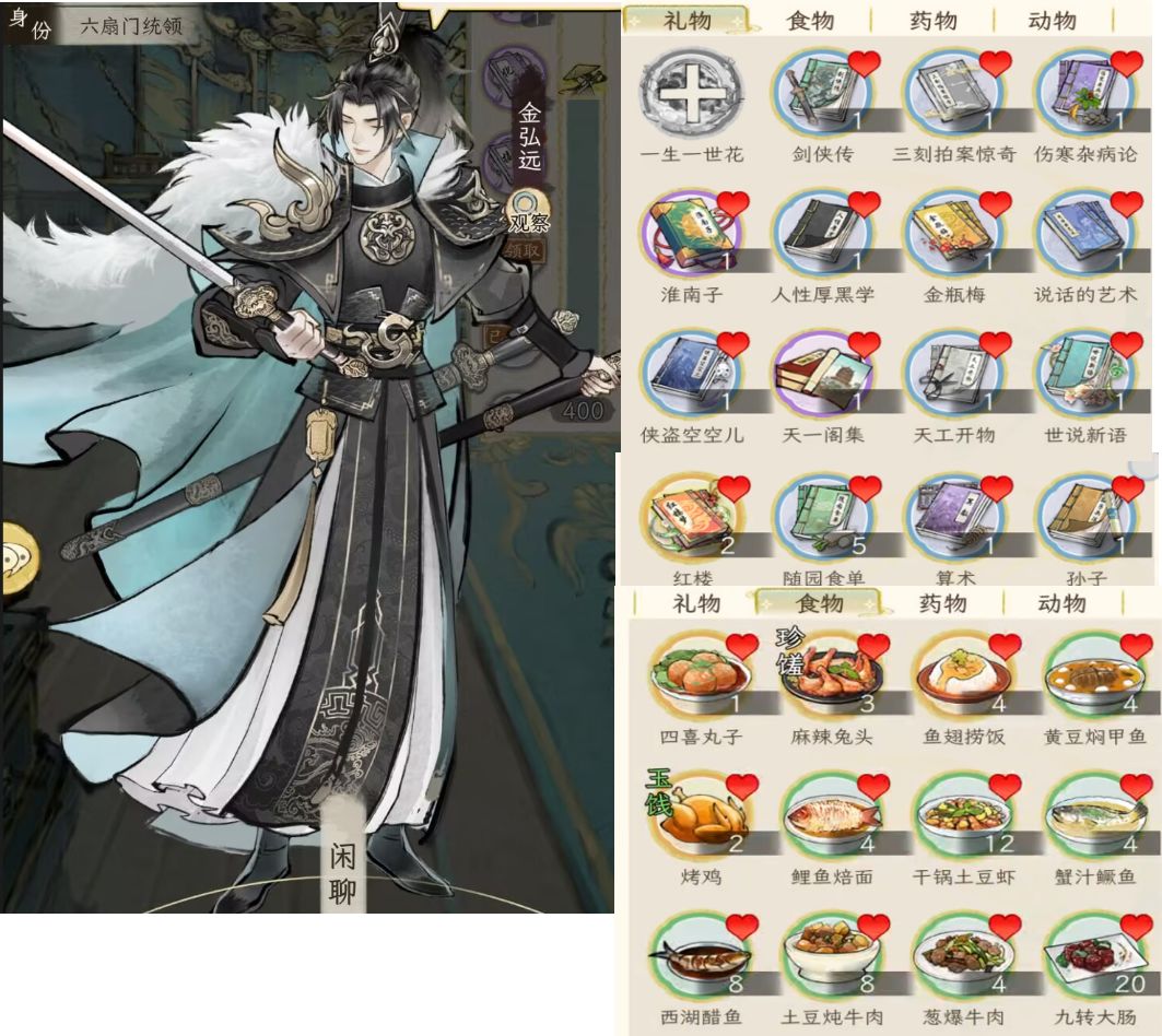 另外,礼品对应加的好感度,与礼品的价值有关,按1:100换算,例如一本红楼2万铜钱,喜爱的人(显示有爱心的),加的好感就是200;如果不是对方喜好的,就打八折,加160好感。食物也是同样的。