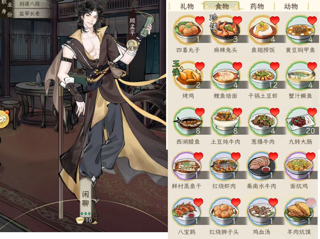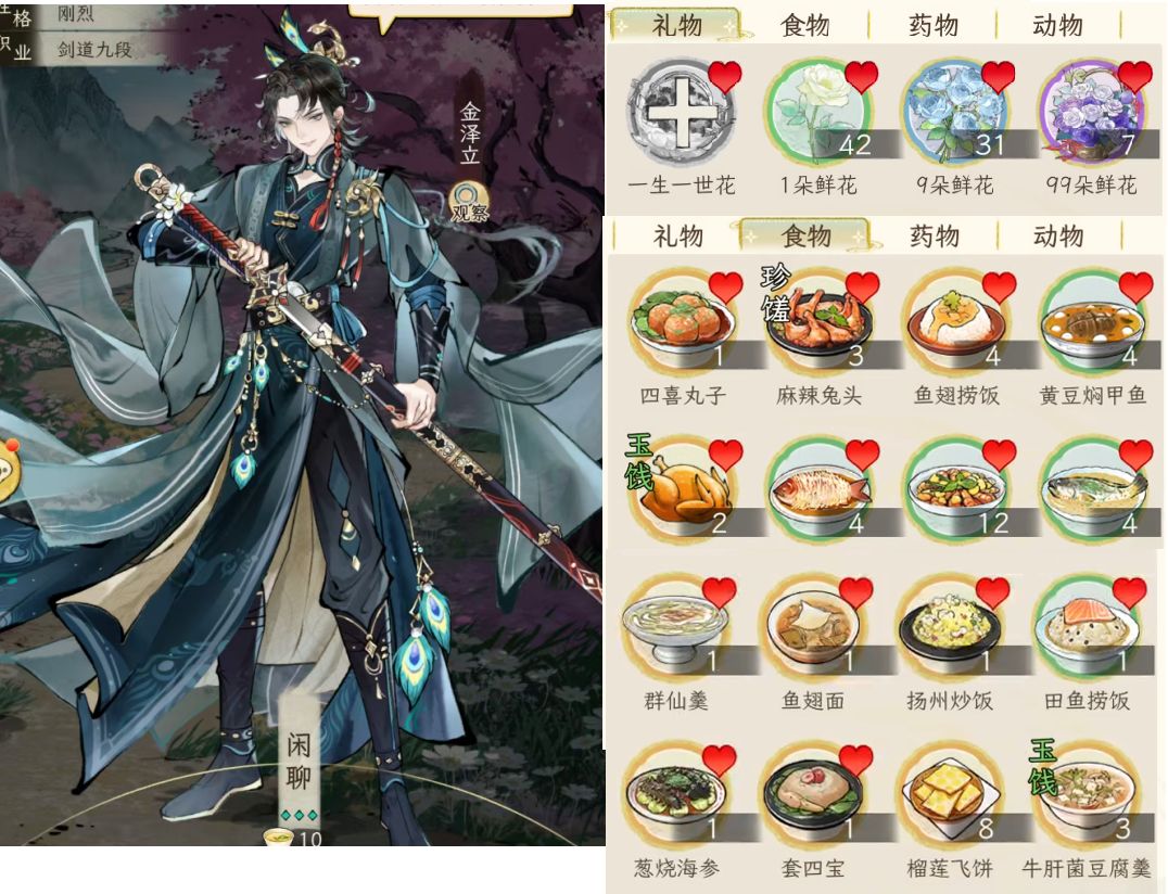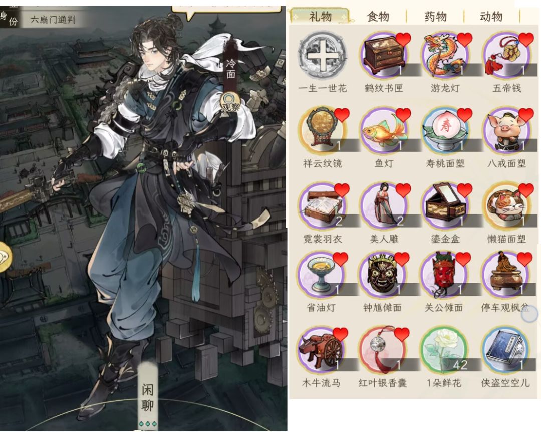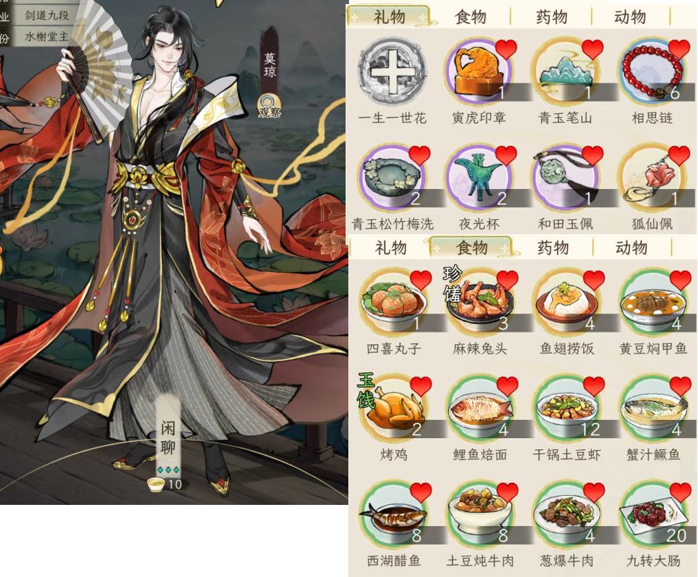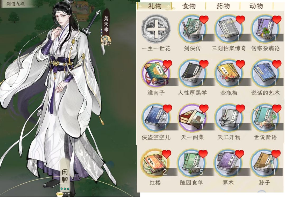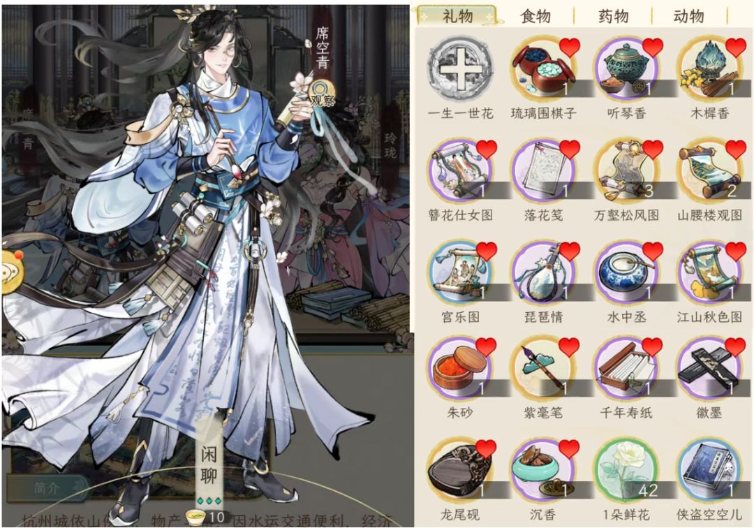 另外,礼品对应加的好感度,与礼品的价值有关,按1:100换算,例如一本红楼2万铜钱,喜爱的人(显示有爱心的),加的好感就是200;如果不是对方喜好的,就打八折,加160好感。食物也是同样的。
