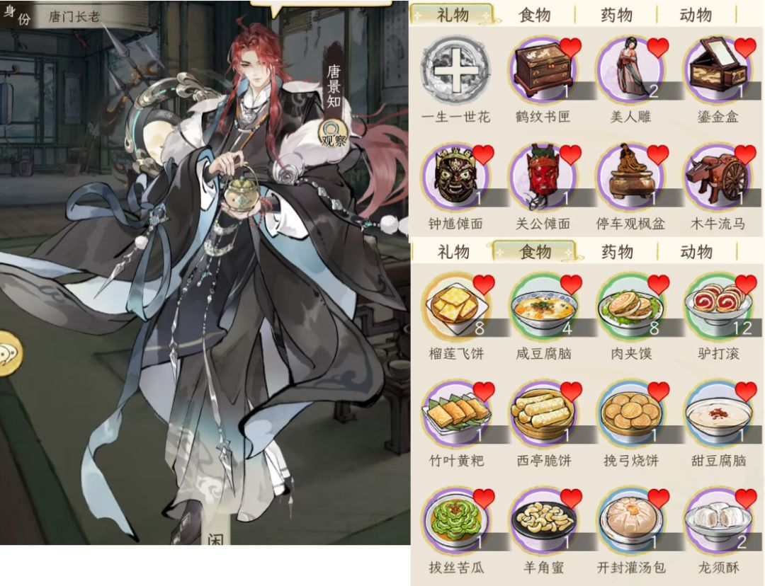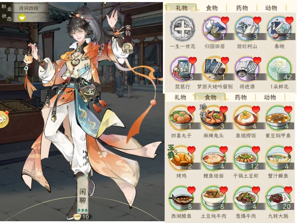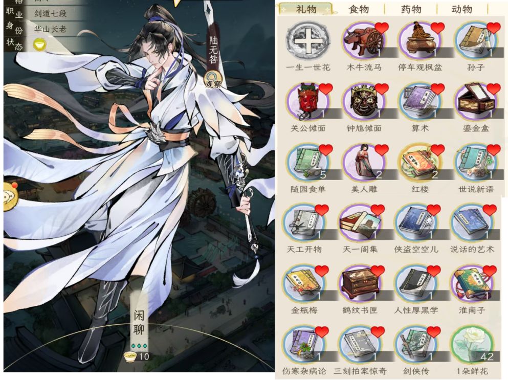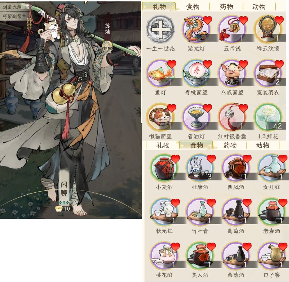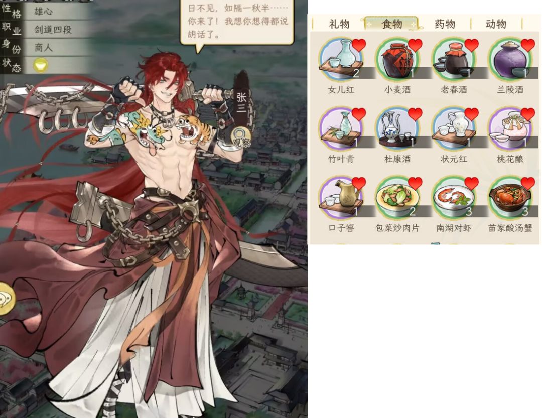 另外,礼品对应加的好感度,与礼品的价值有关,按1:100换算,例如一本红楼2万铜钱,喜爱的人(显示有爱心的),加的好感就是200;如果不是对方喜好的,就打八折,加160好感。食物也是同样的。
