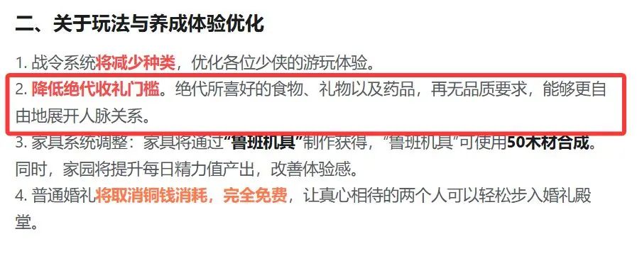 估计是被吐槽了,官方对绝代的收礼门槛进行了调整(以前是低于2万铜钱的礼物都不收的啊
