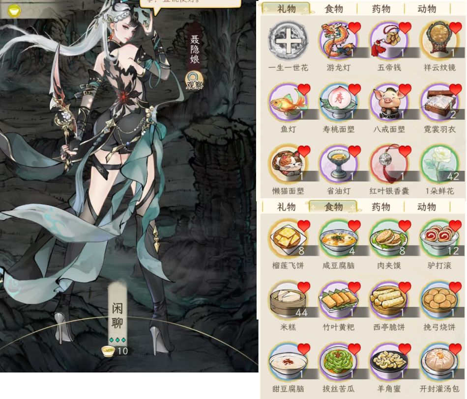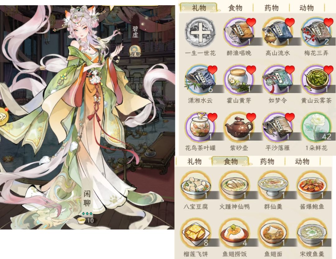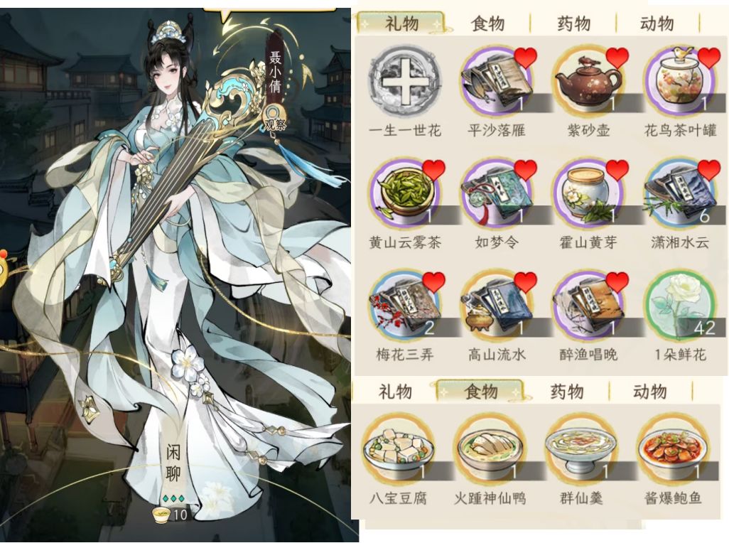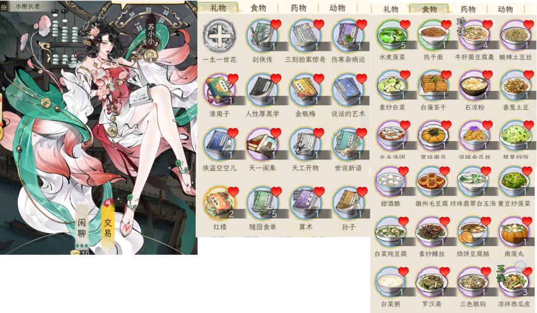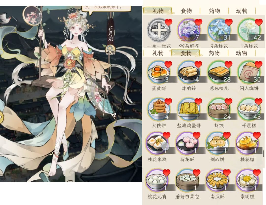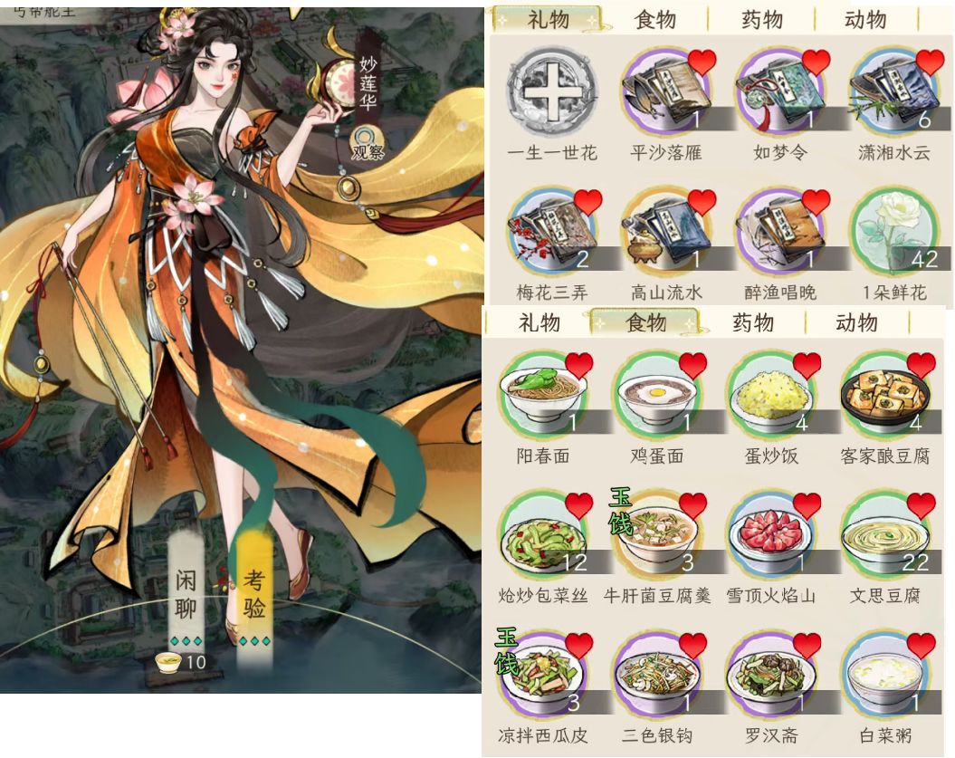说在前头,考虑到礼品获取的难易度,所以这里用于测试的物品都是可以直接从“商城--市集--赠礼”中买到的,除了这些肯定还有其他,例如团福猫珑、仙肴食物,但是这些获取渠道不稳定,所以不考虑,仅供参考。