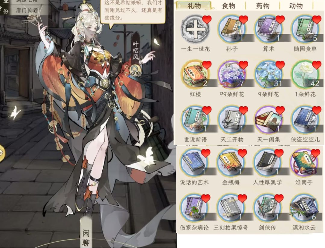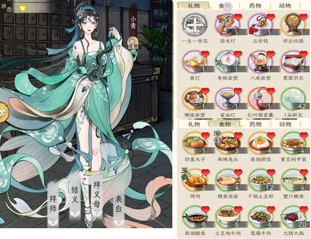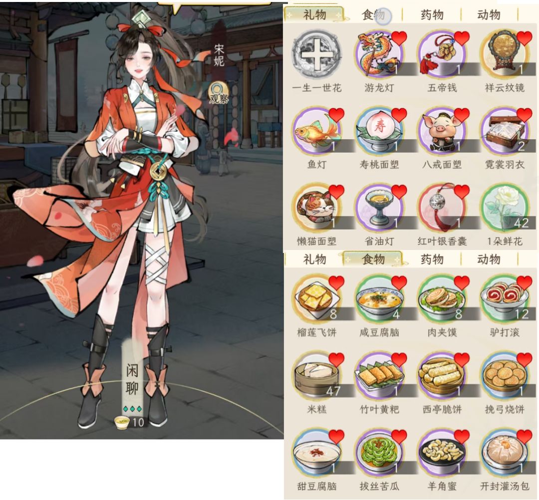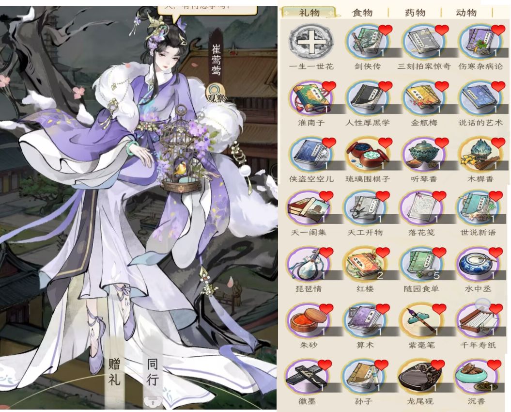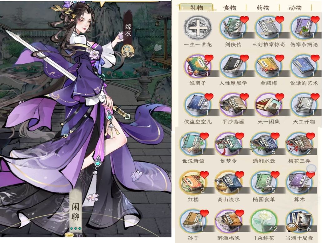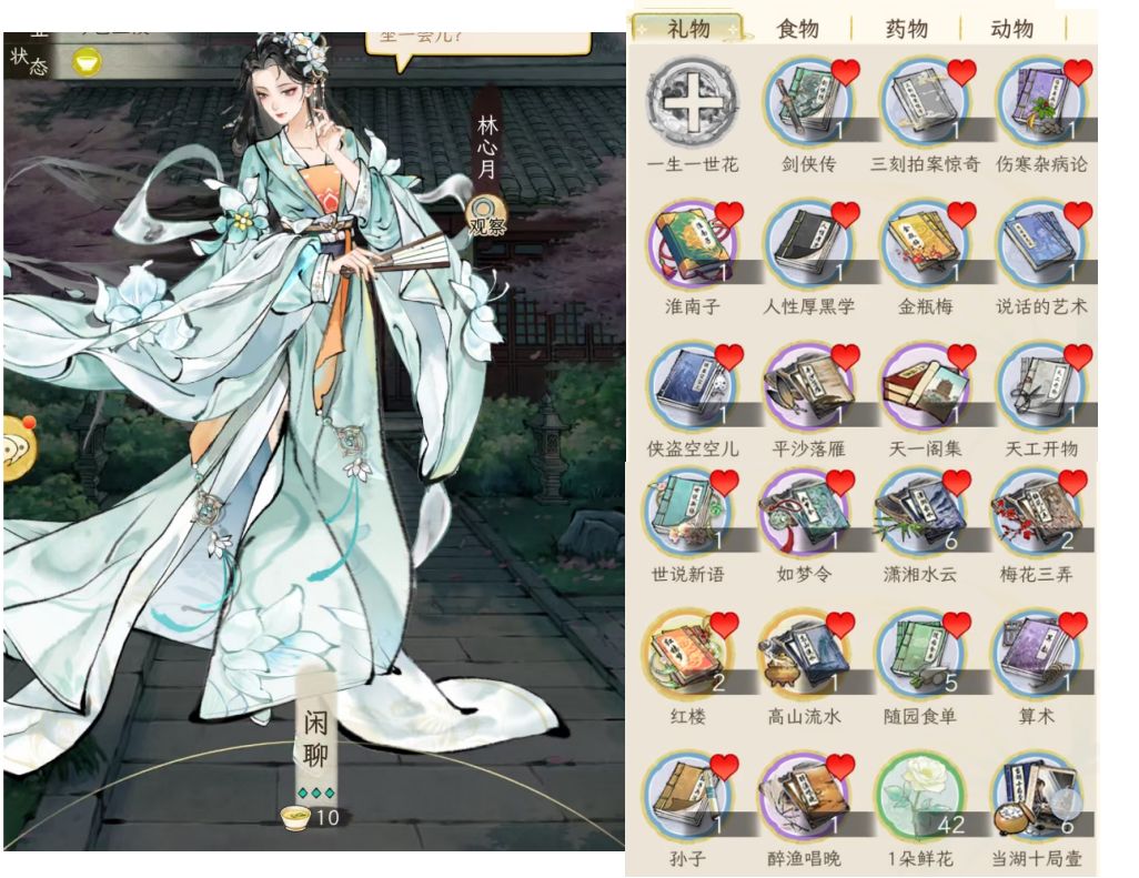 另外,礼品对应加的好感度,与礼品的价值有关,按1:100换算,例如一本红楼2万铜钱,喜爱的人(显示有爱心的),加的好感就是200;如果不是对方喜好的,就打八折,加160好感。