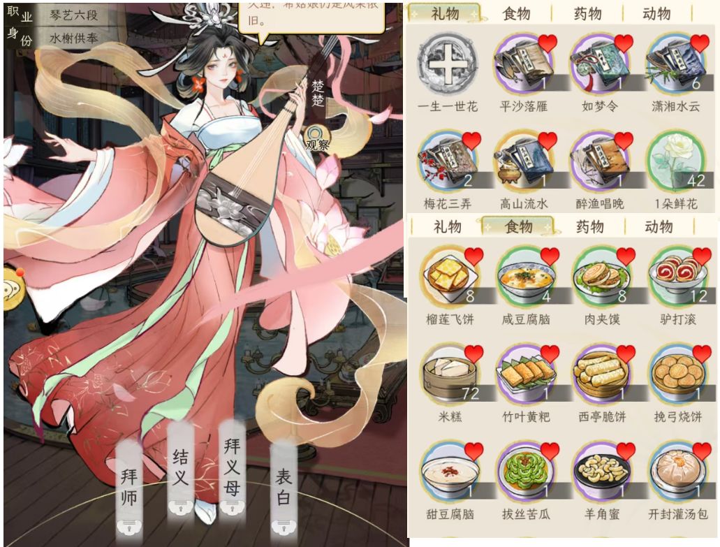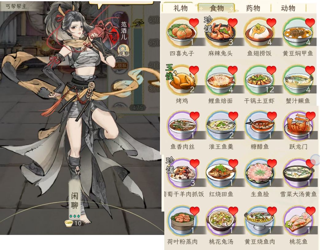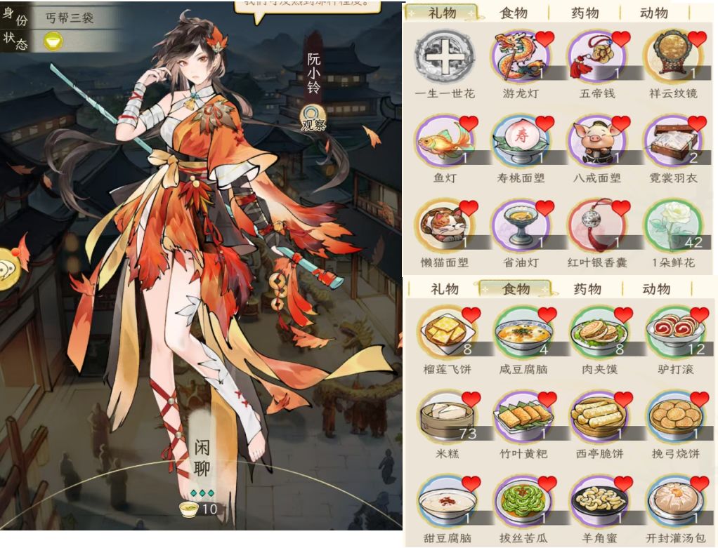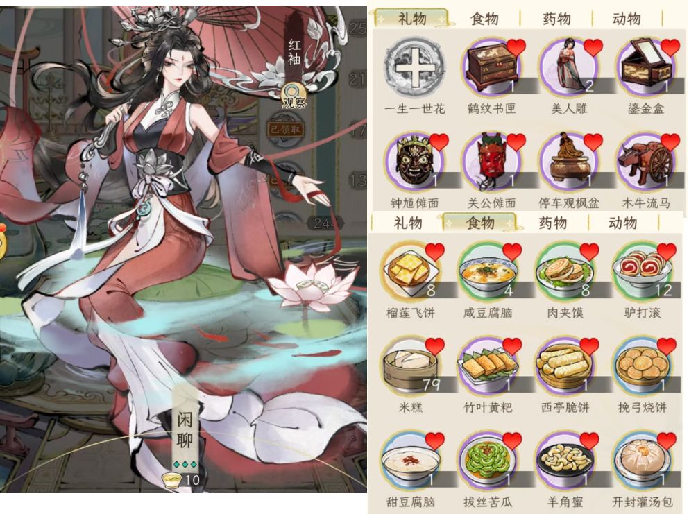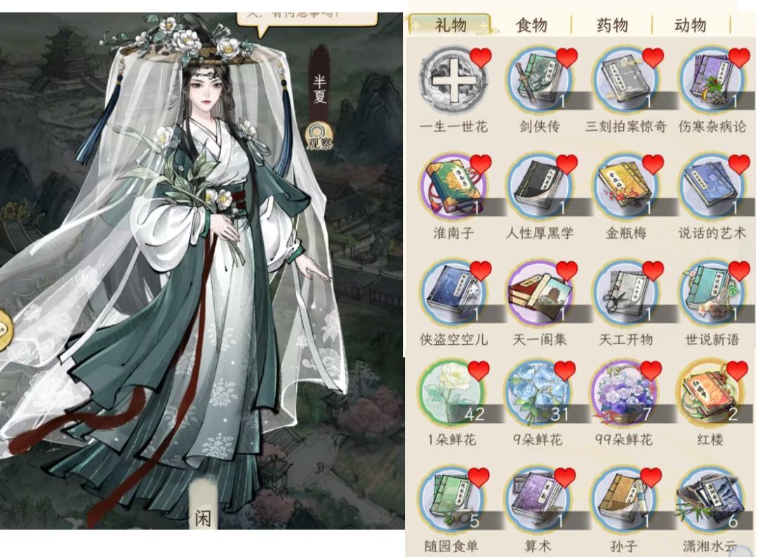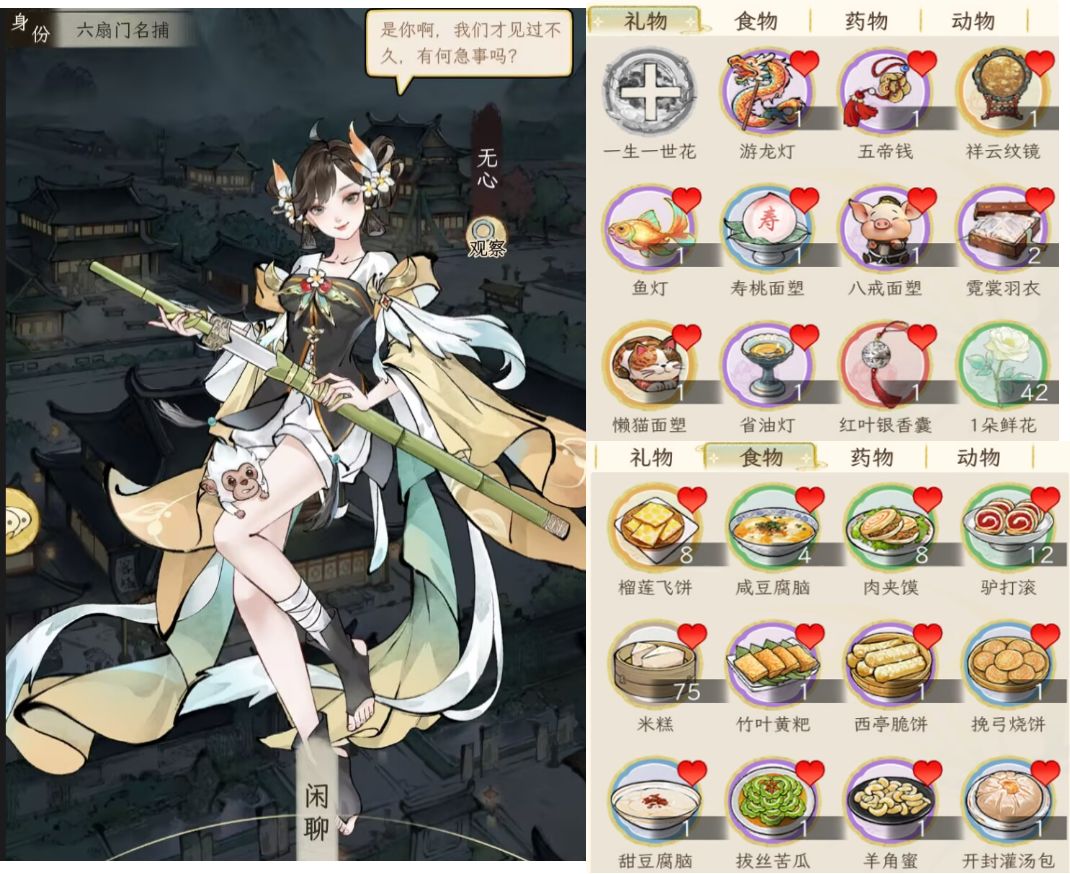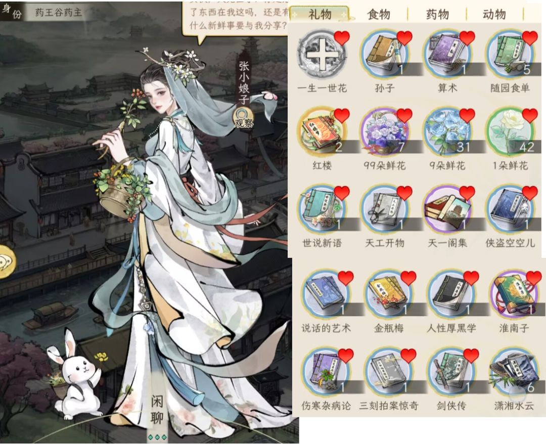 另外,礼品对应加的好感度,与礼品的价值有关,按1:100换算,例如一本红楼2万铜钱,喜爱的人(显示有爱心的),加的好感就是200;如果不是对方喜好的,就打八折,加160好感。