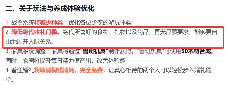 估计是被吐槽了,官方对绝代的收礼门槛进行了调整(以前是低于2万铜钱的礼物都不收的啊