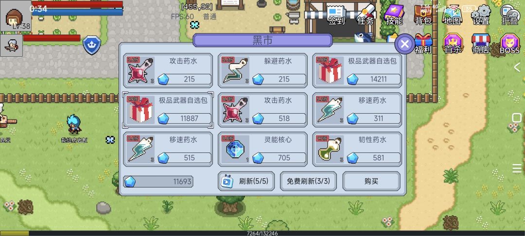 出门门口奸商商店,直接购买武器礼包,没有就刷新,连免费带广告算上初始有9次,不可能一个刷不出来吧?最优的当然是303逆天,(此处已修改,普通不刷灭天)没有的话300神功也行,因为200以上武器不需要等级,所以可以直接穿戴,如果300逆天的话,直接就相当于纯攻击加点零强化160级全装水平,前期BOSS撒撒水