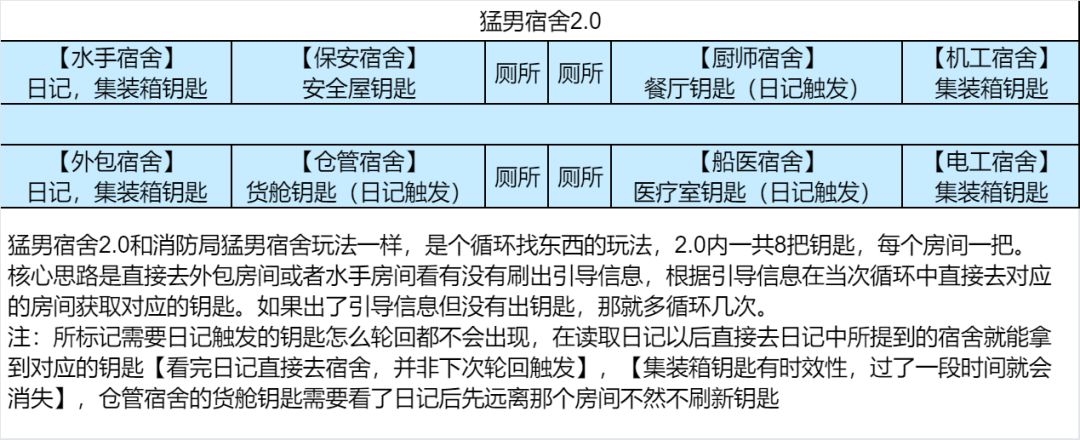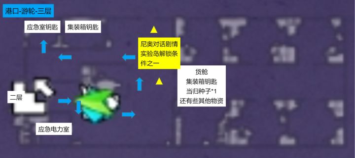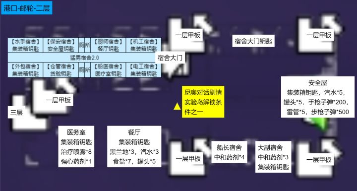 PS:这里需要说明,实验岛一共6个集装箱,6把集装箱钥匙都在实验岛的猛男宿舍3.0内,如果邮轮和实验岛的集装箱钥匙不分开一次性用完,后期发现有遗漏的时候,哪处钥匙拿过哪处没拿,非常难排查,所以建议在拿实验岛的集装箱钥匙之前,一次性拿完邮轮的集装箱钥匙,并且开完邮轮的集装箱,再去动实验岛的集装箱钥匙;