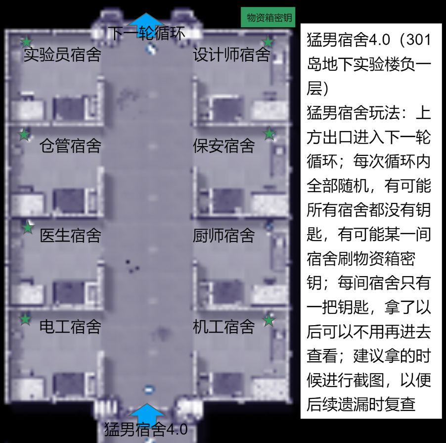 猛男宿舍的玩法就是无限循环中随机刷新道具,每一次循环中可能会有一间或多间房间内刷新道具,也可能这次循环中没有房间刷新道具,或连续多次循环中都没有刷新,这个是正常的,个别房间刷新有前置条件,不满足前置条件可能会一直不刷新,每个房间内刷新的道具拿过以后,无论多少次循环都不会再刷新道具,每个人的轮次刷新情况都有可能不一样,出猛男宿舍可以左下角点回营地出去;