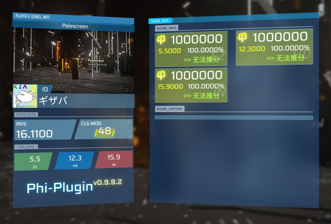 除此之外,神秘节奏也对谱子有影响。一方面,谱子本身bpm低而且节奏诡异,感觉有一堆跳拍,另一方面Jeitie动效对于dubstep那种一顿一顿的演绎又使读谱难度加大,很容易爆蓝或者定位不准。不过说回来,Jeitie的表演动效依旧牛批,这次黄键表演太阳的想法也是让人眼前一亮,而中间被戏称乌蒙段的表演也很棒。但我确实觉得神秘黄键有点不明所以,所以没给高分。反观ez和hd,在配置和动效表演上倒是很精美,尤其hd各种表演很适合让新手体验Phigros的魅力,故给高分。