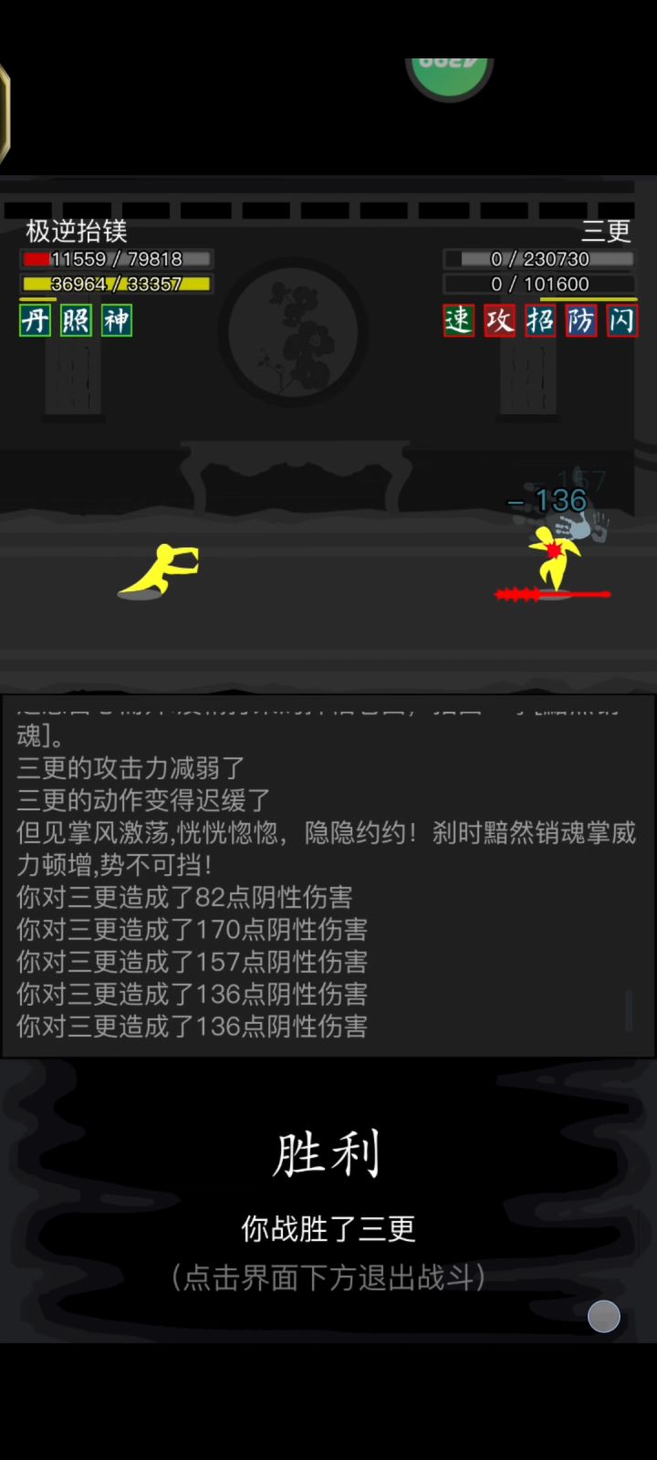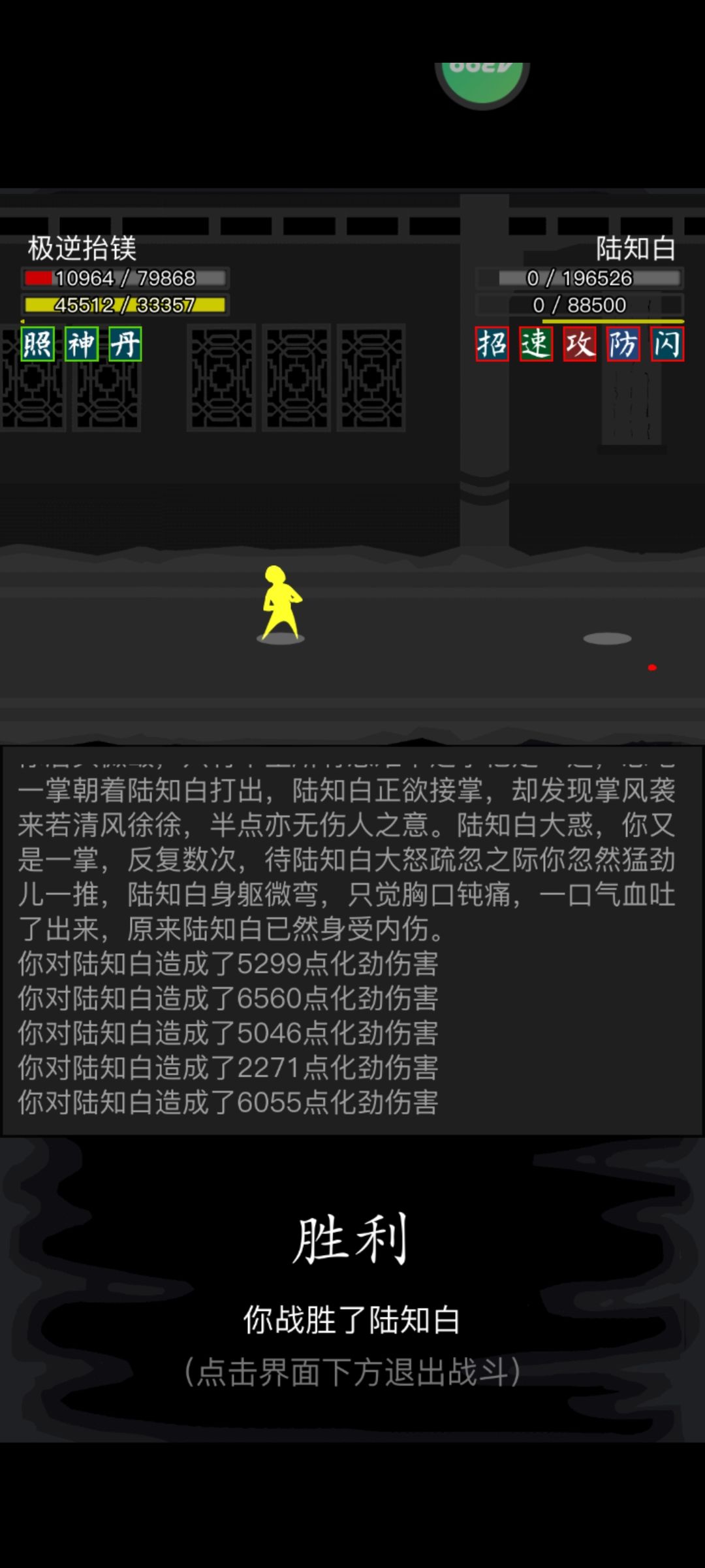 因为这三个怪物可以磨血,所以可以先磨内力,打化劲伤害,因此离殇销魂掌那万年不用的惟别而已就派上了用场,开始先用惟别而已打化劲磨内力,磨完快速去找白老先生压低血线,这样惟别而已就能打出高额伤害,记得加力为0,不然没有神照经,长生诀很容易空内!