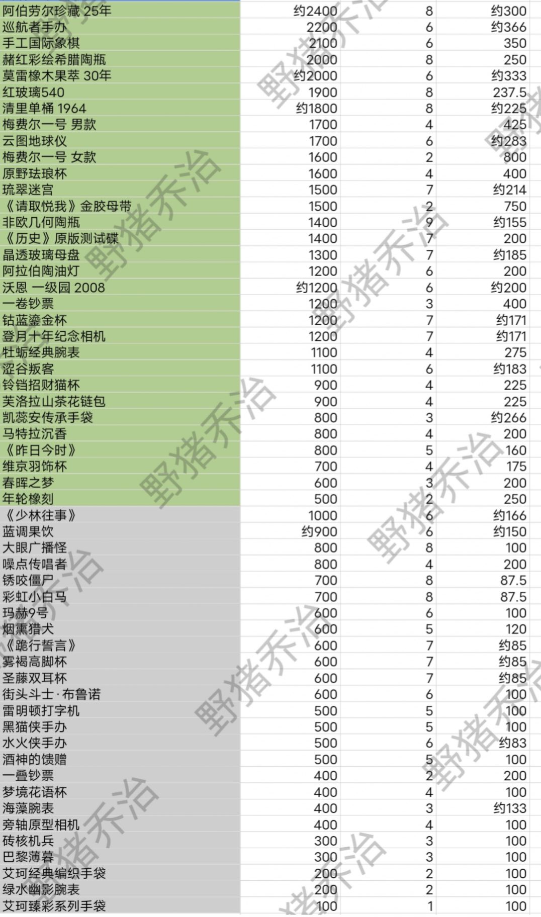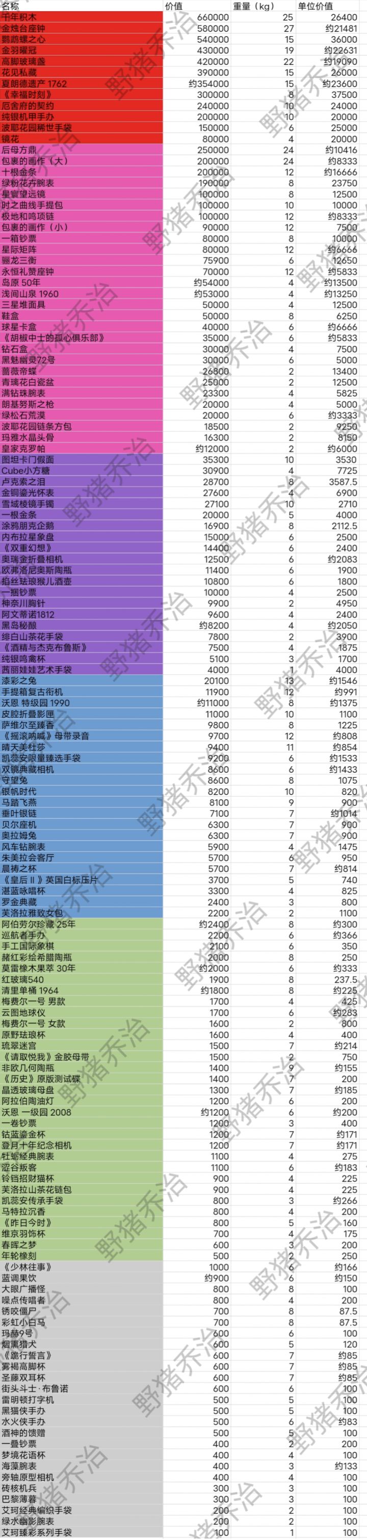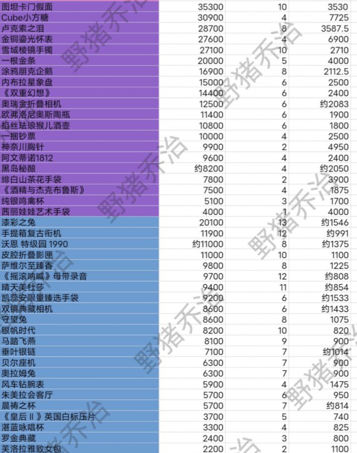 部分收藏品数值