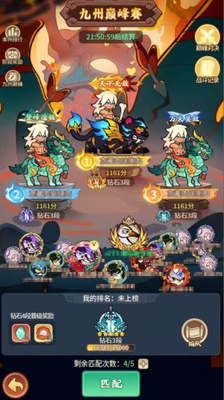 • 每次根据段位、积分等随机匹配对手,战胜获得积分,战败扣积分。
