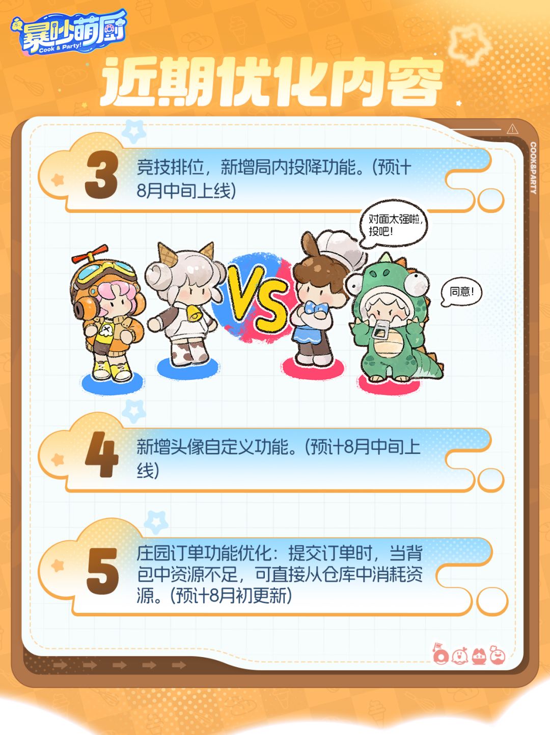 最近的暴吵萌厨会有哪些优化呢?小厨给料理师们带来了已确定的最新优化速递!