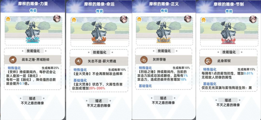 ①摩根最重要的雕像是正义,必须生成,基础数值越高越好。烈焰之锤buff是可以一直存在的,终伤对标神青,这也是随从可以取代神青的基础。基础强化叠加攻击力总加成,越战越强。