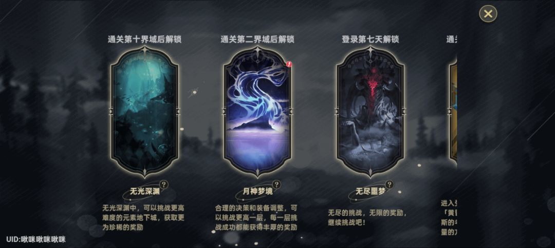 游戏主要玩法是秘境-无光深渊,俗称爬塔(实际是挖坑往下爬)。然后附加几个小副本。