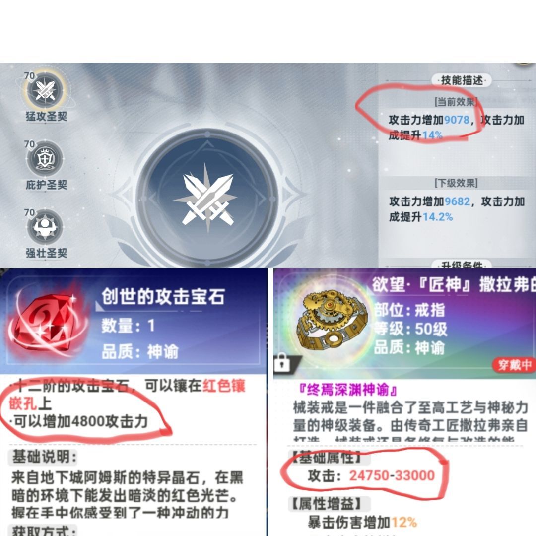 卡关主要注意图上的三点:战技前三基础技能,宝石,装备品质。这三个是游戏基础属性的来源。其他属性都是在强化这个基础属性。