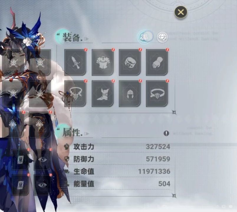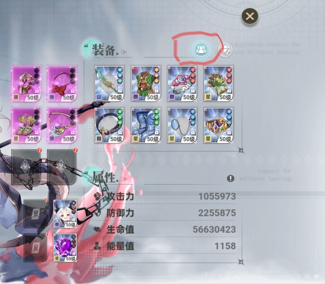 ①页面显示的角色是主战角色,更换在左下角(防涉黄我直接就剪切掉了,也可在阵容里切换)。配好第一个队伍后,点击装备栏上方配队图标。