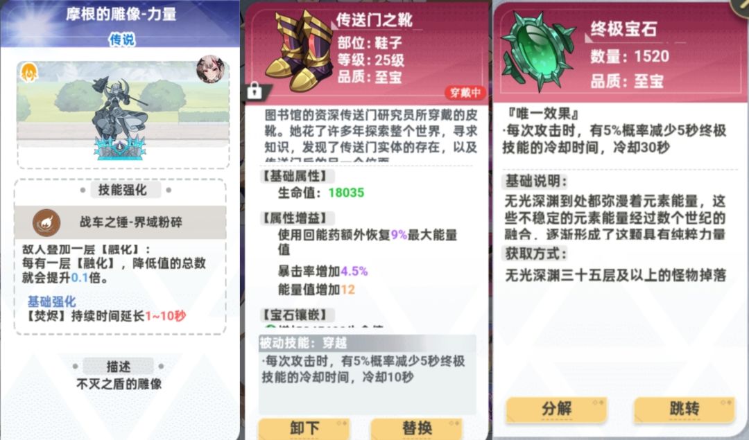 ②很新的萌新,堆不到50%技能冷却时间减少。建议带粉色吉他(6.2武器推荐第一个),直接提供20%。这样大招冷却是24S。然后去主线3-5左右层刷25级鞋子传送门之靴、魔瞳宝石带个终极宝石。第一歌雕像优先获取力量雕像,不用生成,基础数值也有多少用多少。