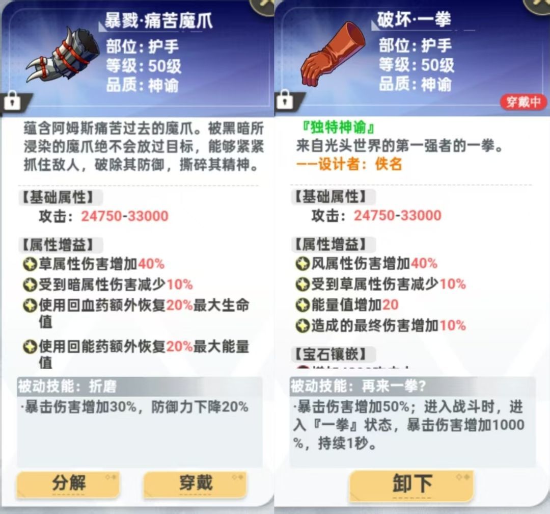 前期基本就是一拳超人了,好的暴击护手都在1400以上。