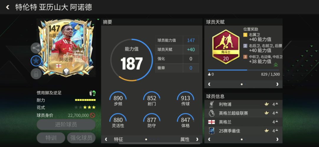 游戏中,阿诺德推出的赛季最佳终极球员卡基础能力值达到147,配备了角斗士天赋,对他的加速、传中、人盯人等数据都有提升。作为一名边翼卫,阿诺德速度优势明显,攻守兼备,