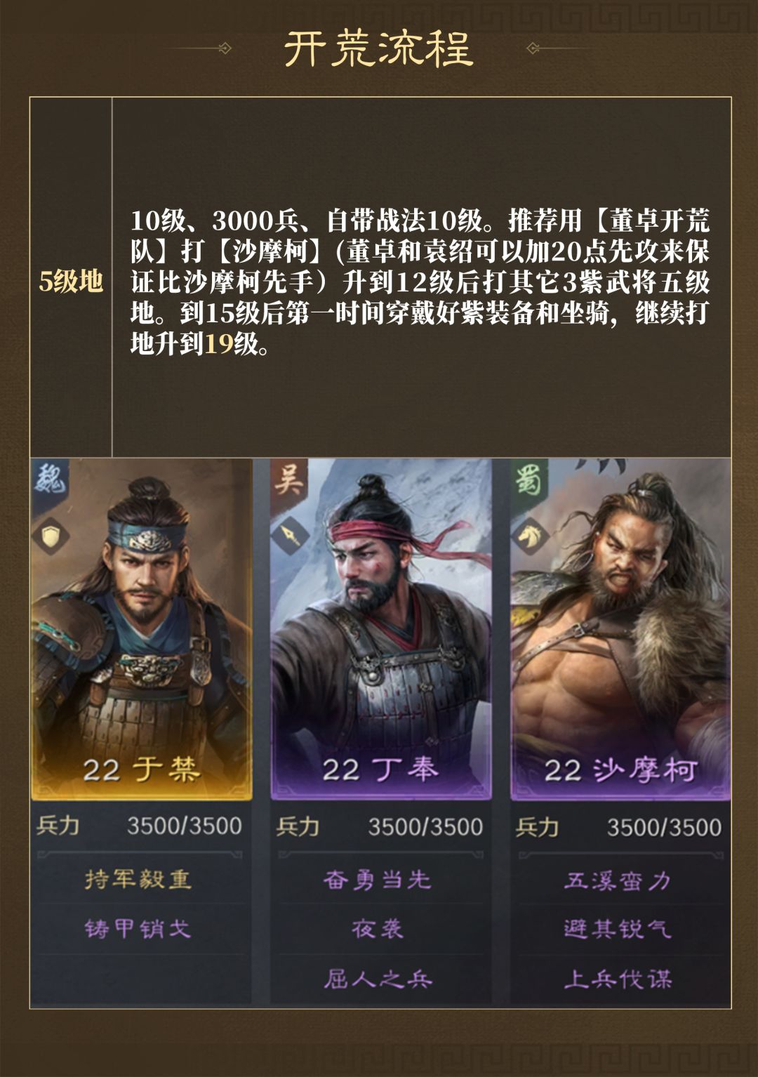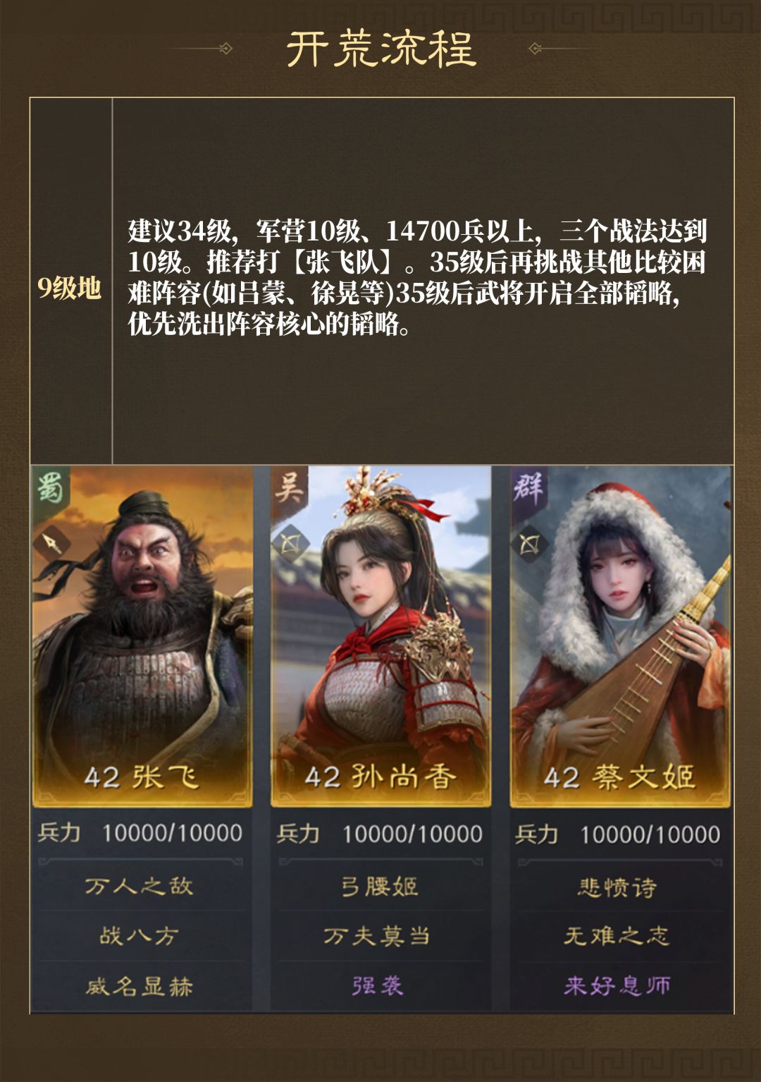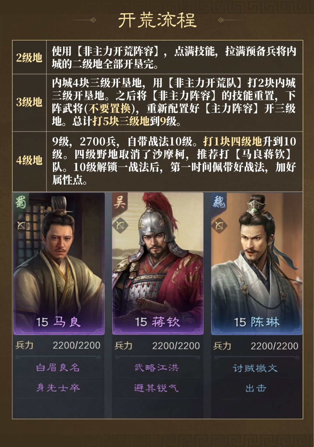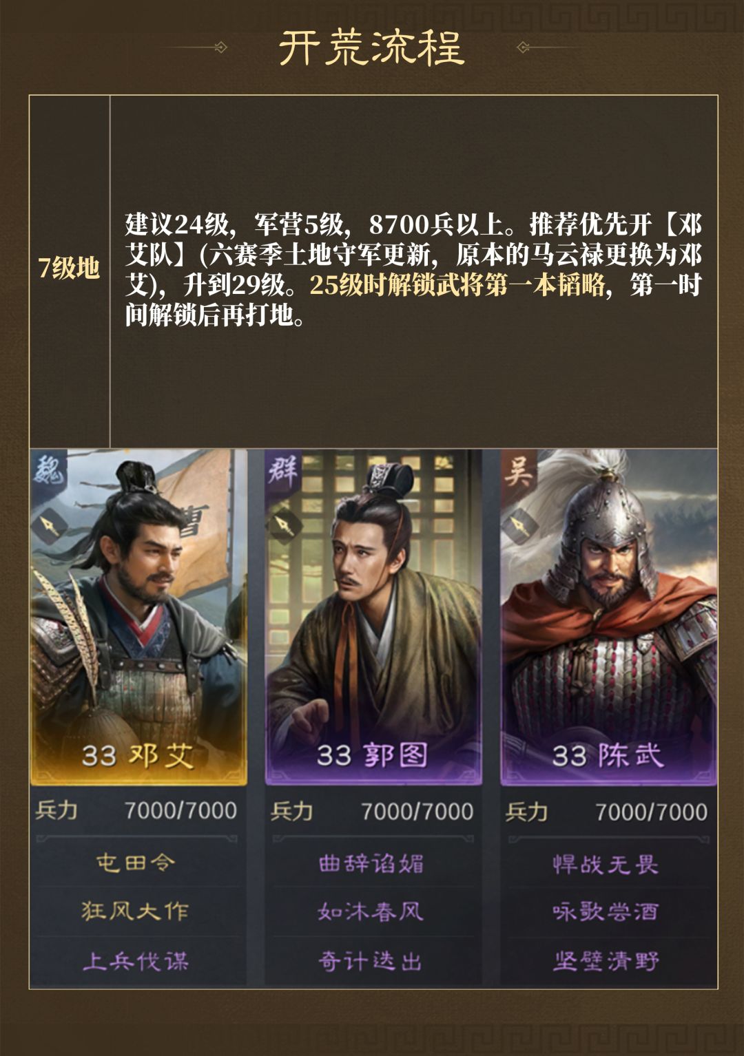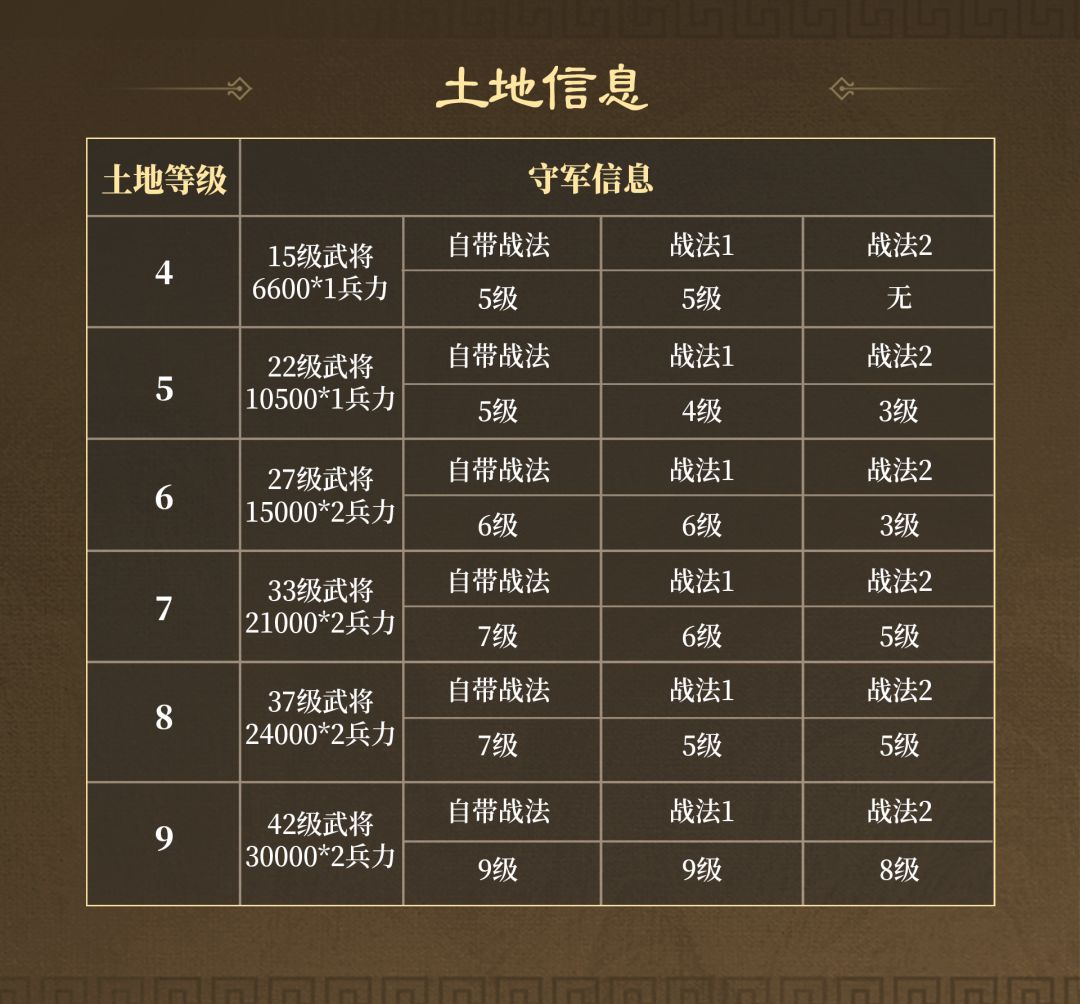 注意:「业铸山河」剧本的10到12级部分土地守军阵容将调整,10到12级土地守军攻打难度有所提升(携带战法改变,部分战法等级提升),开荒时注意查看土地守军再判断是否攻打。