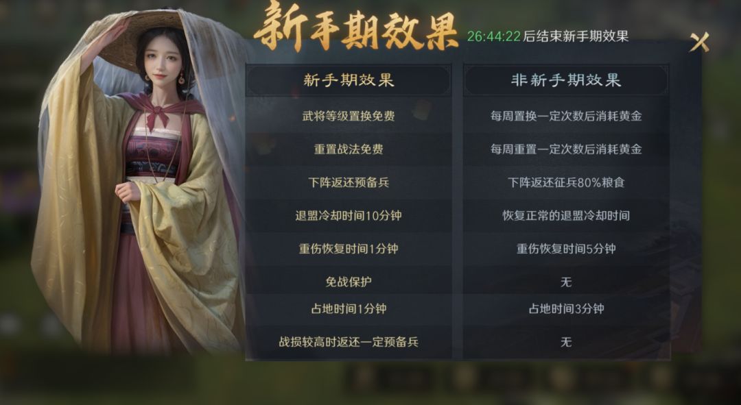 2.新手期有很多利于开荒的效果,如置换武将免费、重置战法免费、占地时间为一分钟等。