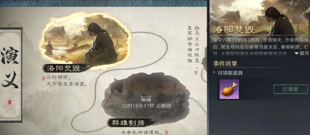 问鼎赛季全新剧本「业铸山河」中,演义玩法「洛阳焚毁」事件解锁后可领取一个烤鸡,请合理利用。