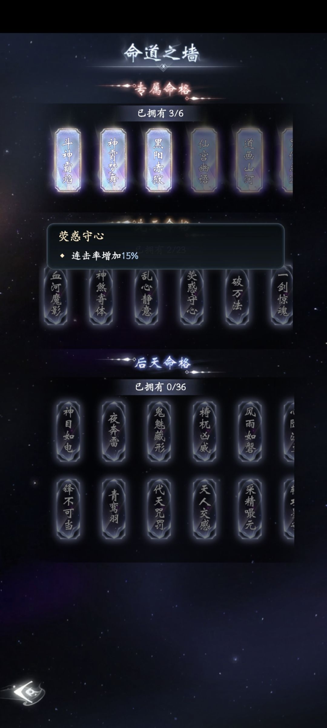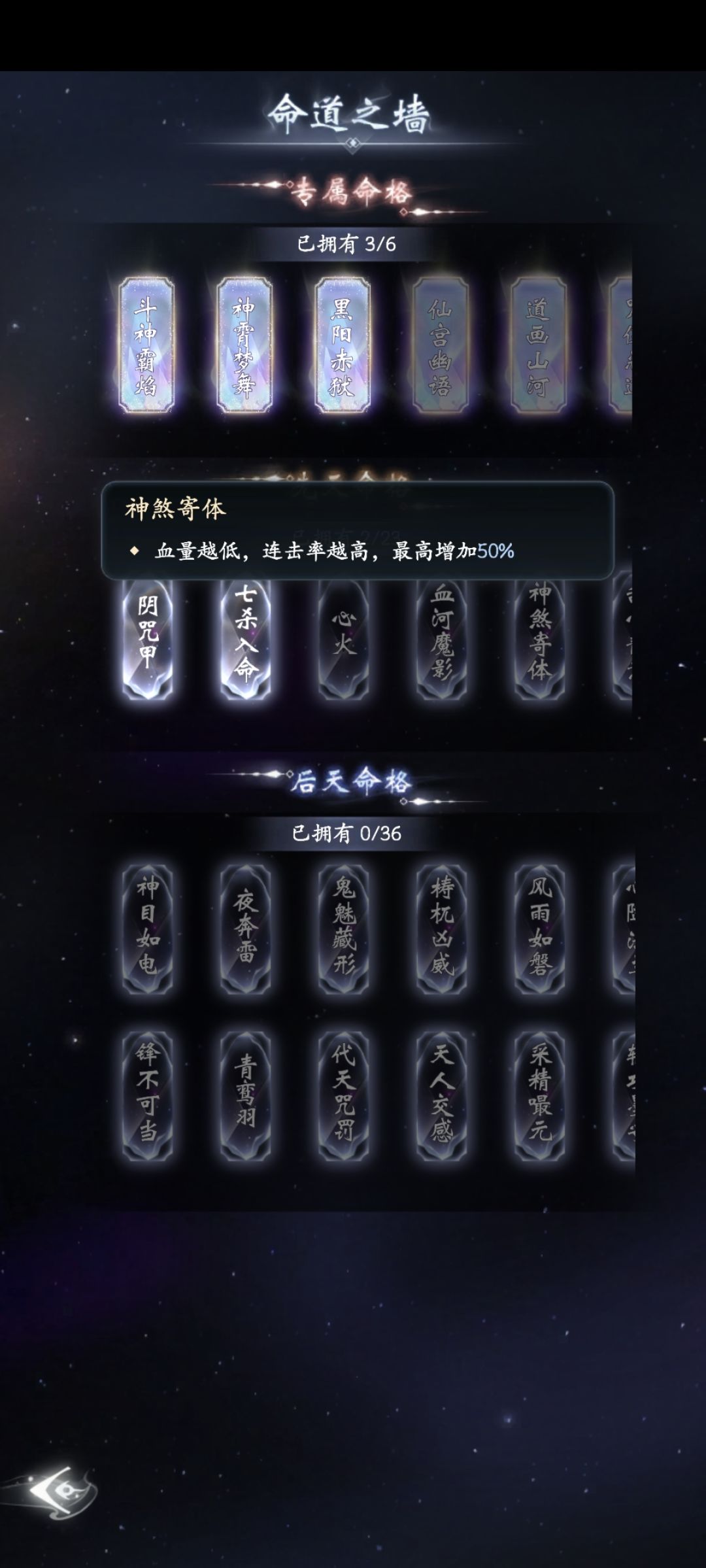 如第一张图,就是弟子本身所携带的命格,目前命格比较强的有七杀入命,萤惑守心和神煞寄体。