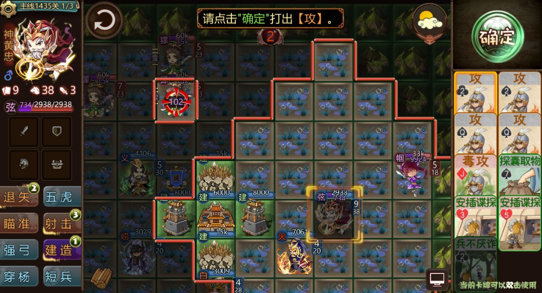「儒雅」:可消耗1次攻击次数,翻开牌堆顶端9牌,然后获得最上面一张计谋牌,翻开牌中每有1张基础牌恢复25兵力,回合限2次。