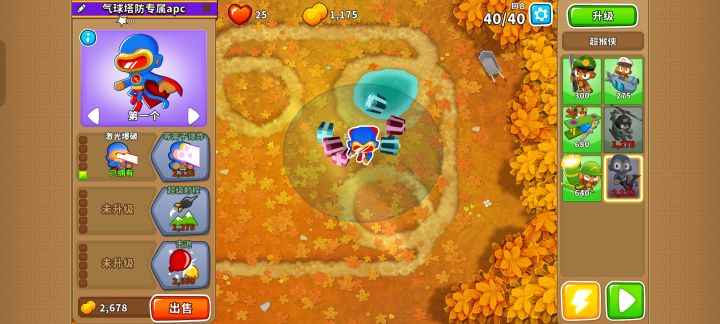 先在图上这个位置放下100超猴侠,右侧范围与路线相切,等钱够了就赶紧升到110,就能有惊无险地通过,如果运气不好就多试几次!