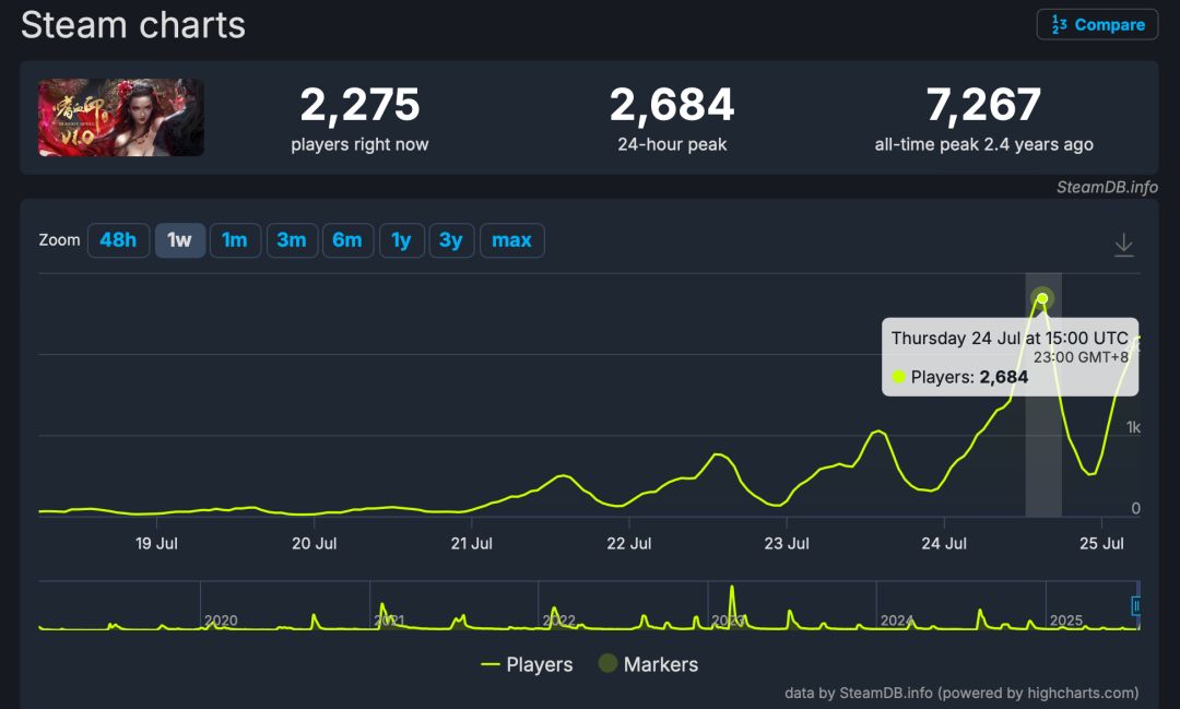 或许是此次优惠力度较大,《嗜血印》标准版和豪华版登上Steam国区热销榜前十。因此,本作的同时在线人数也迎来了一波小高峰,24小时内在线玩家人数来到了2684人。